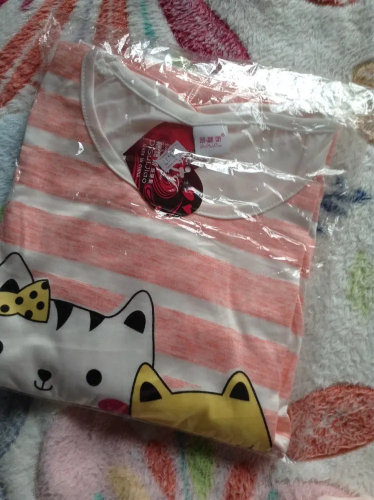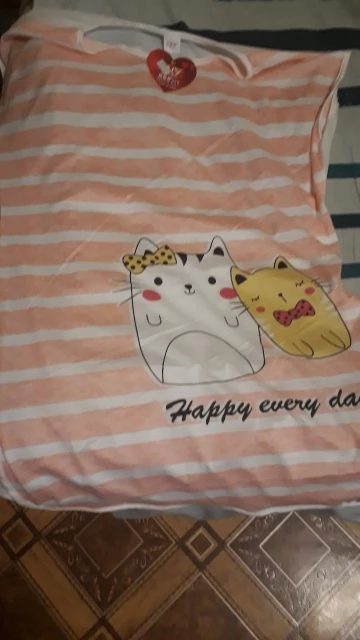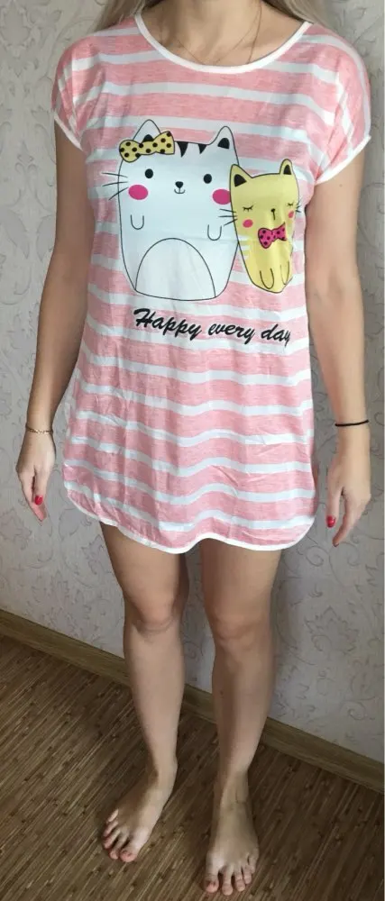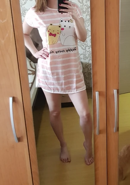 Посылка прилетела довольно быстро... Я была приятно удивлена качеством ткани. Бесподобный нежный розовый цвет и две милые киски. Очень тоненькая, мягкая, приятная к телу ткань... Этикетки с описанием ткани нет... Думаю, это не чистый хлопок, т.к. есть небольшой блеск, но ткань классная... Теперь о размере. У меня 112/90/122, обьём руки вверху 38см. Рубашечка оделась и даже не сильно обтянула... Но так как это ночнушка, я немного распорола на пару см. рукава... Вот теперь полный кайф... Рекомендую товар