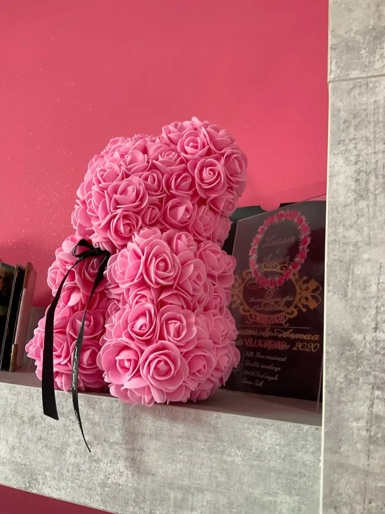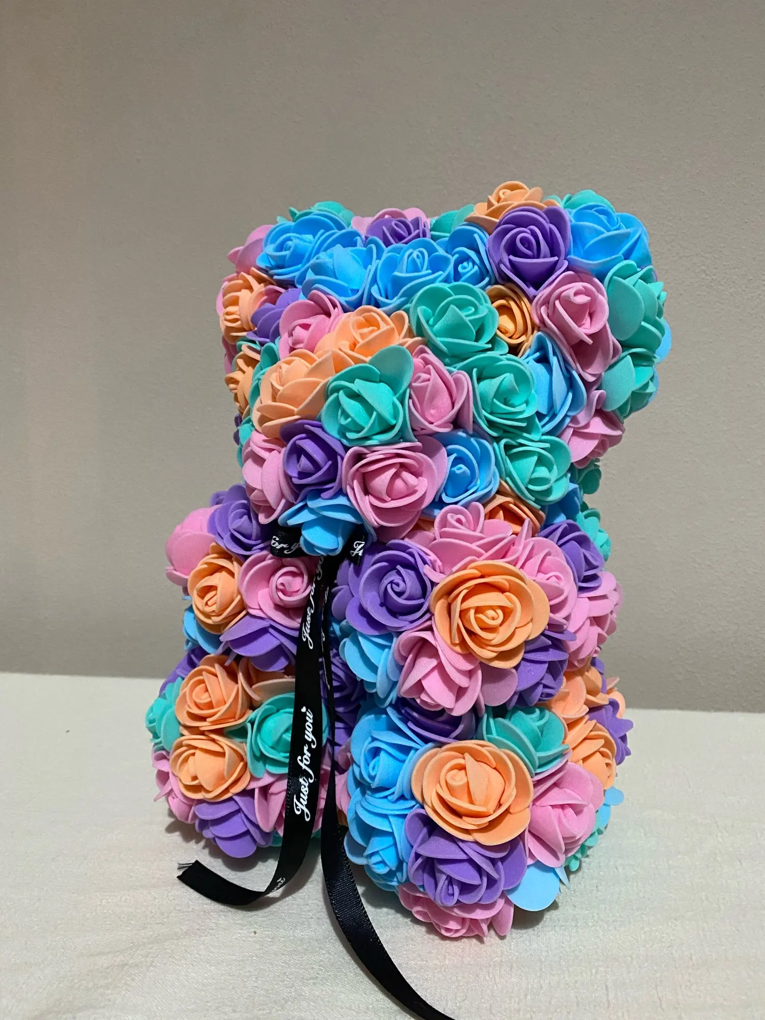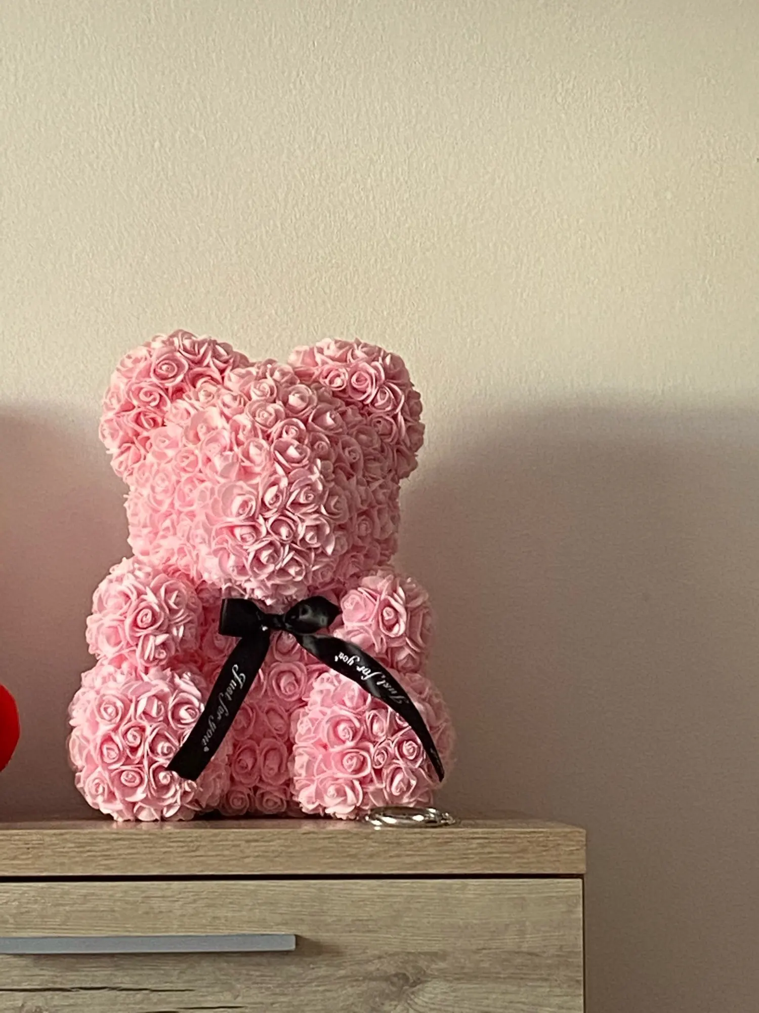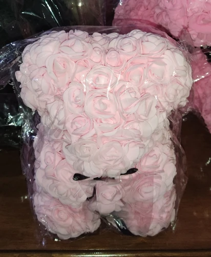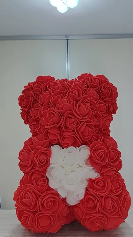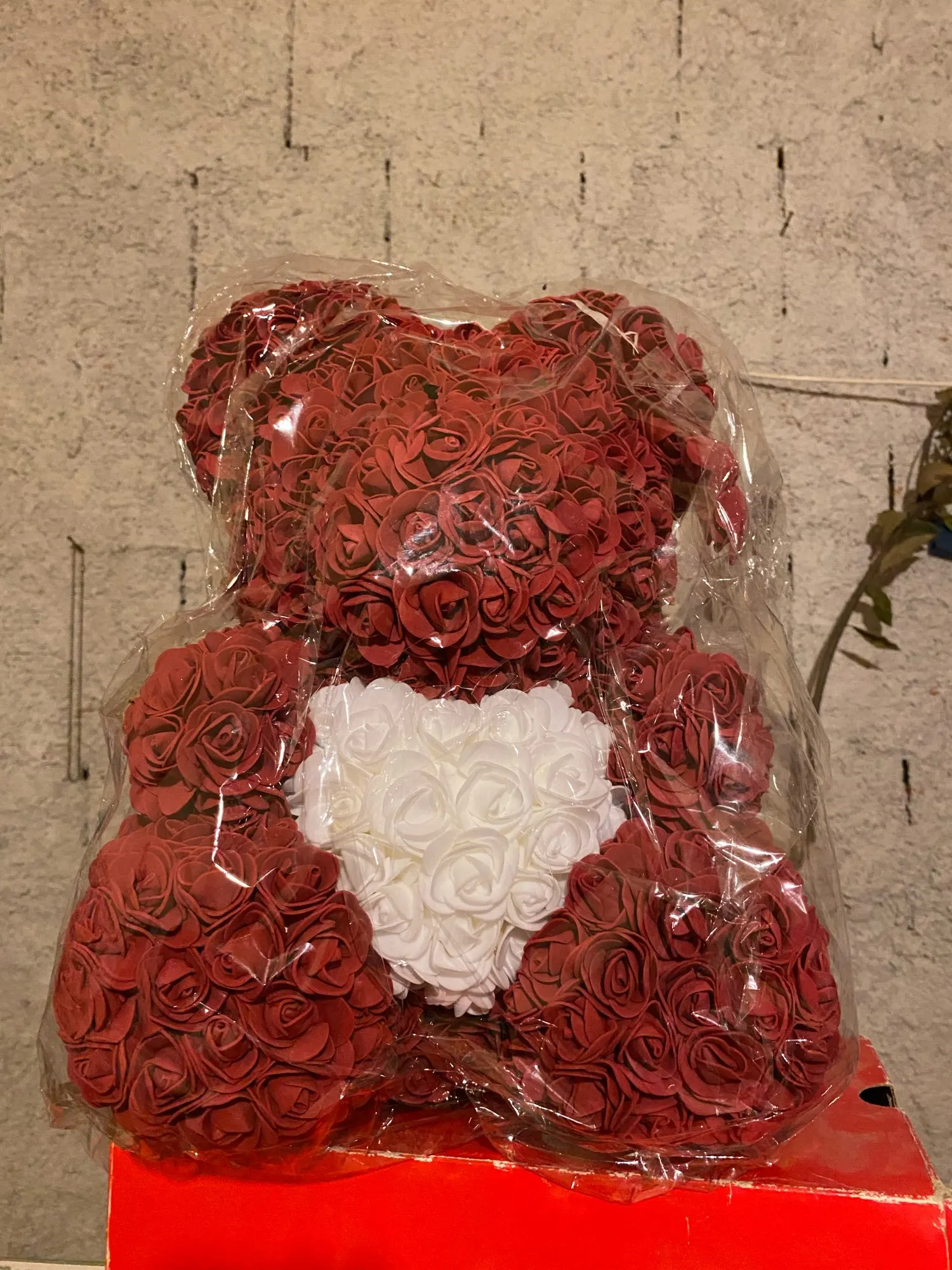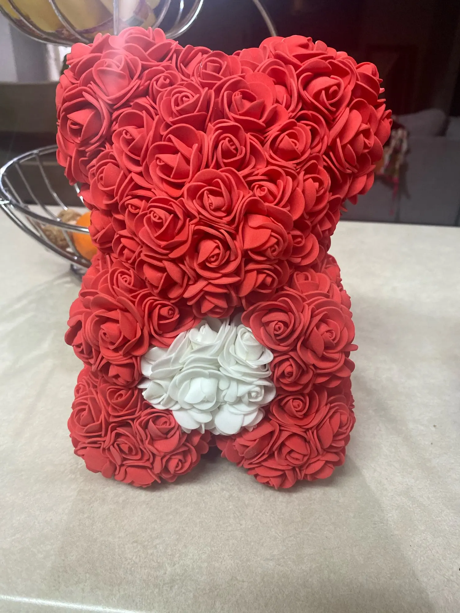 Медведь сделан с цветами, тканевыми розами, он очень красивый, но он очень хрупкий, это просто для украшения, вы не можете обнять, потому что розы очищены, он поставляется с 2 запасными розами, это правильный медведь, чтобы дать, Мой муж дал мне это в мой день рождения, и мне понравилось.
