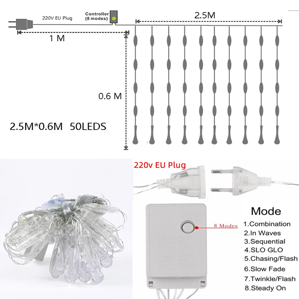 ХарактеристикиLED Water Drops Stars Curtain Lights