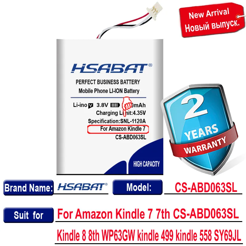 Описание: 1. Литий-ионный аккумулятор 2. Напряжение: 3,8 в 3. Емкость:2000 мАч 4. Подходит для Amazon Kindle 7 CS-ABD063SL Kindle 8 WP63GW kindle 499 kindle 558 SY69JL