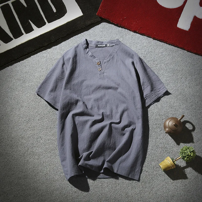 Рубашка Мужская льняная с V-образным вырезом и коротким рукавом