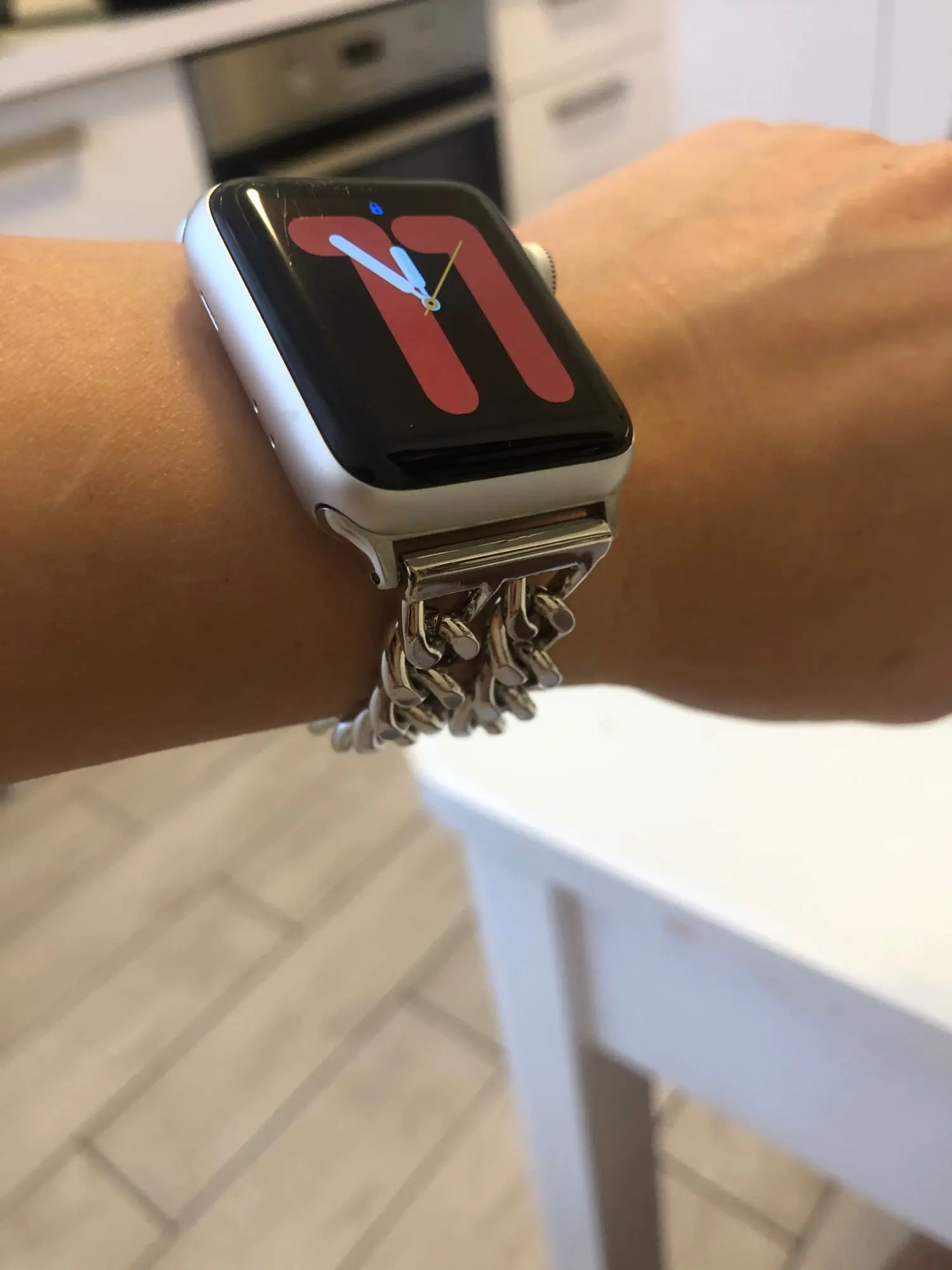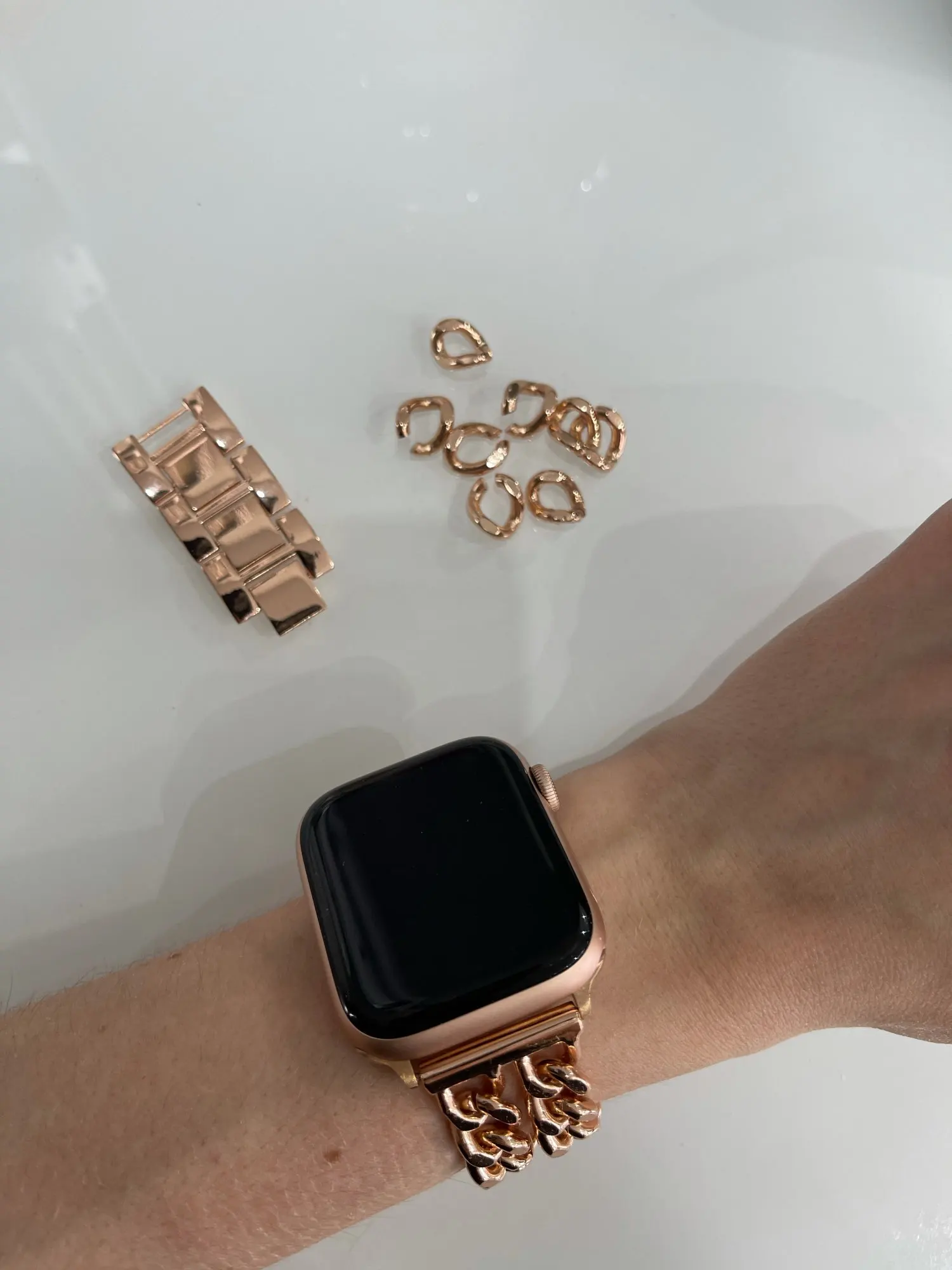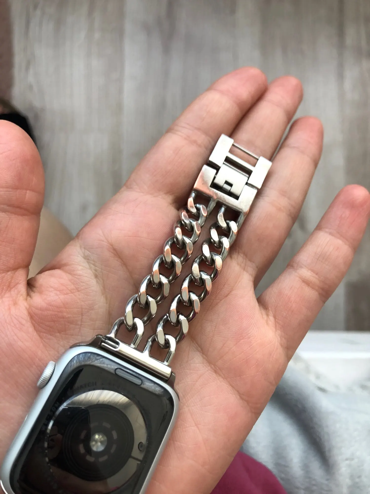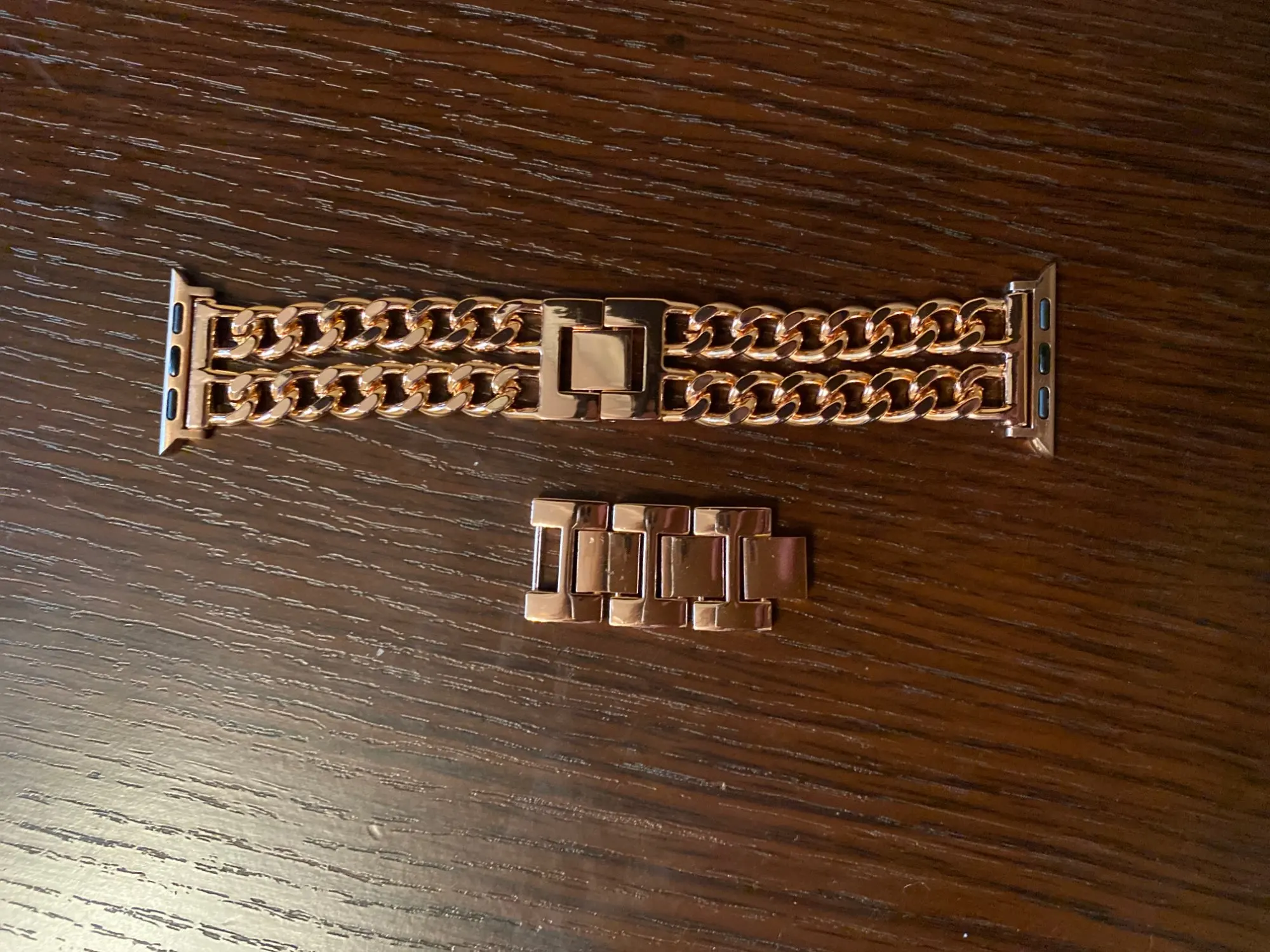 Очень крутой ремешок! Первый раз решила заказать через Пятерочку и мне заказ дошёл за 10 дней!!! (Свердловская область). Обычно такая мелочь почтой идёт по 2-3 месяца, буду сейчас всегда заказывать так. Муж весь вечер убирал мне звенья))) у меня просто ооооочень худая рука. Заказывала на iwatch 4 44mm. С каждой стороны убрали по 2 звена, щас сидит идеально!