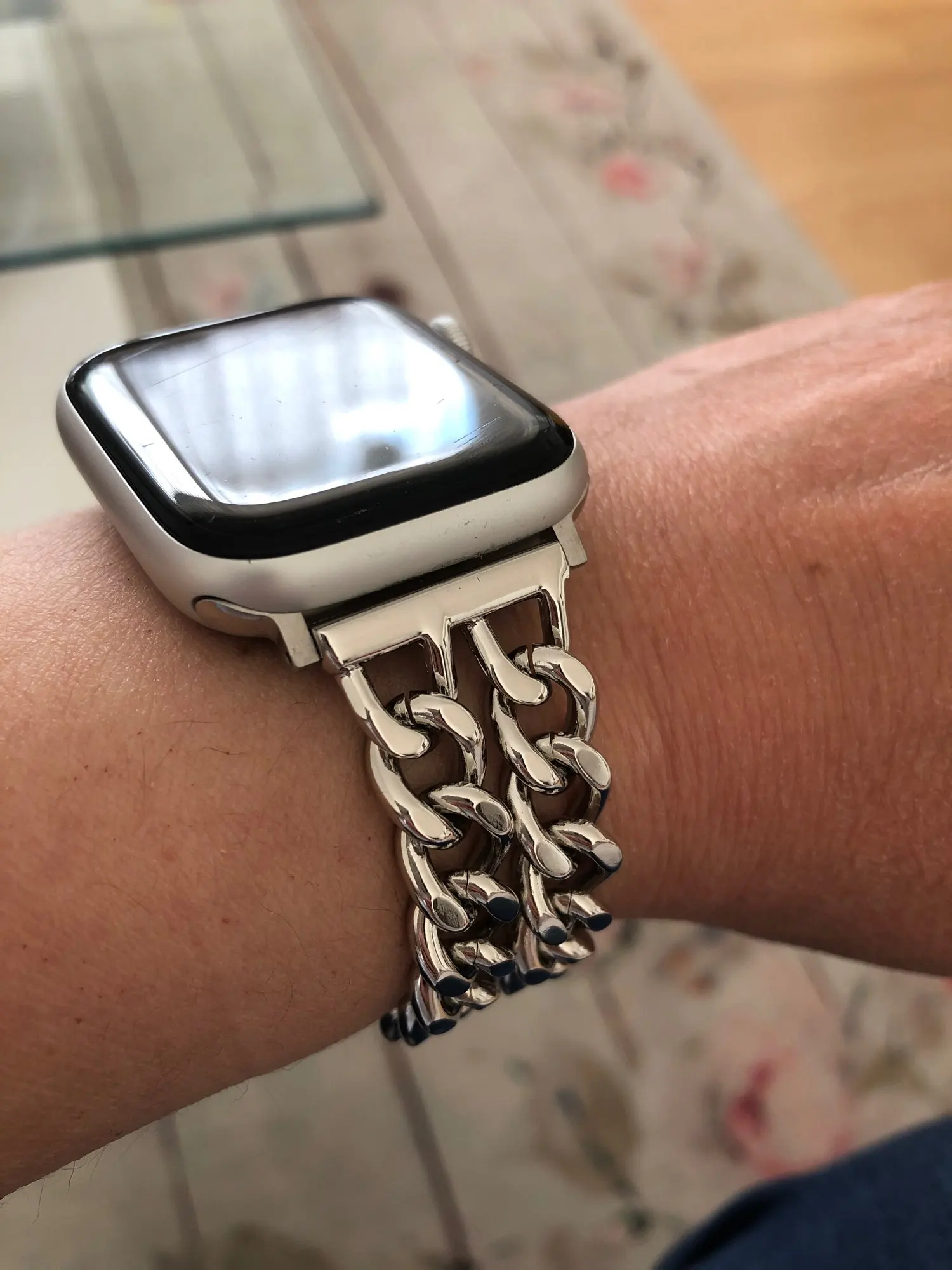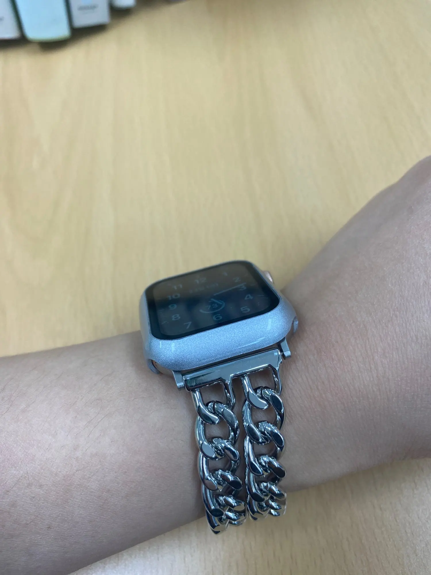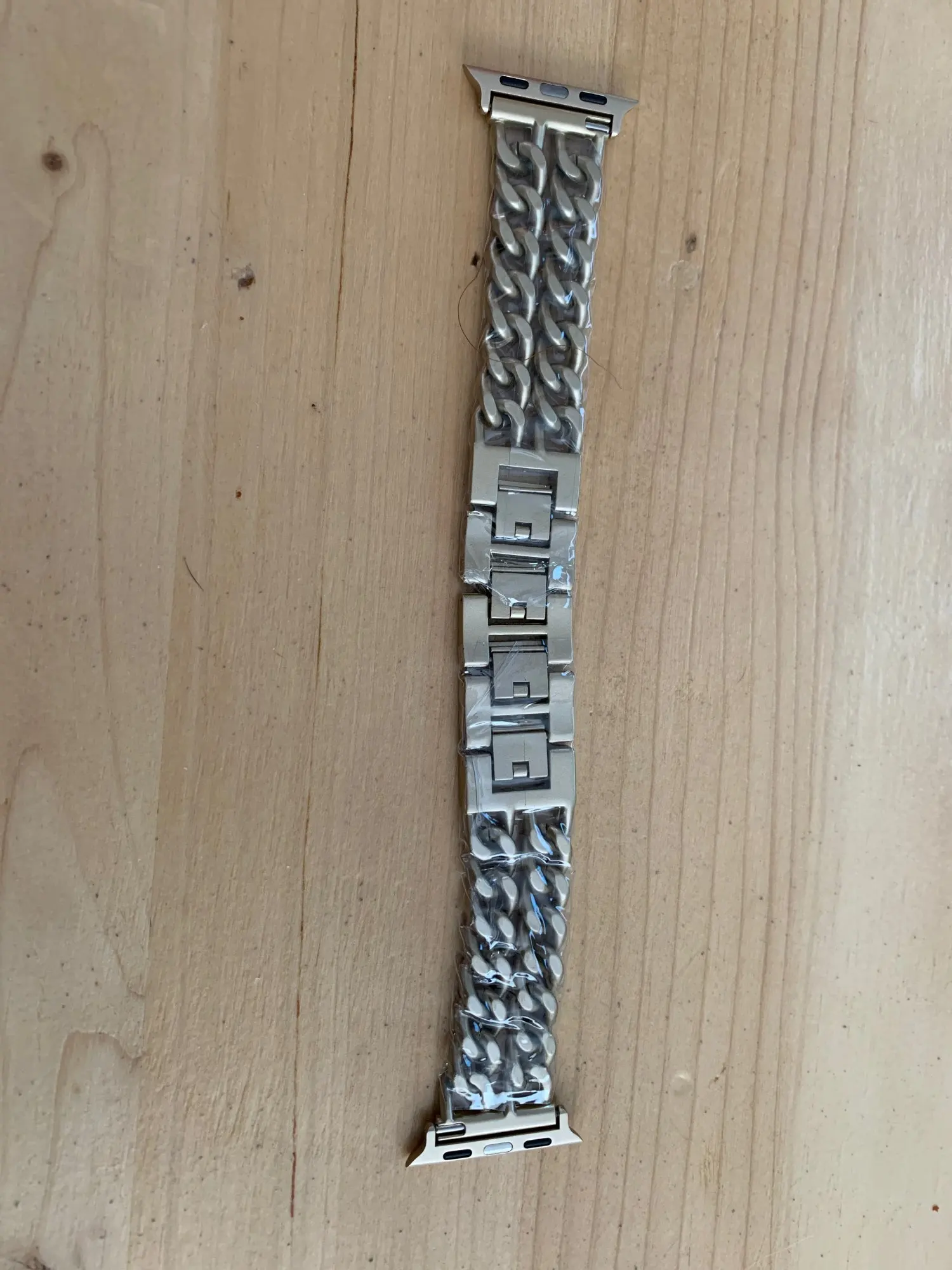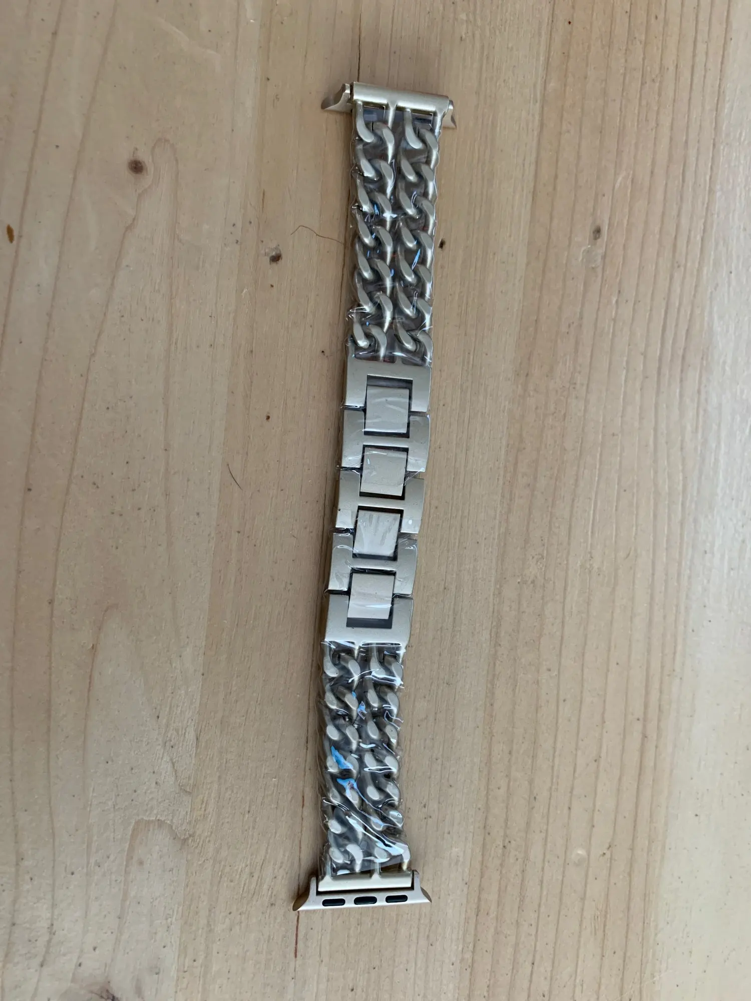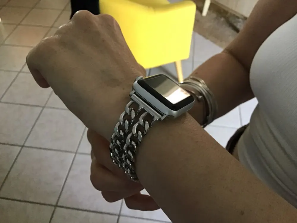 Очень крутой ремешок! Первый раз решила заказать через Пятерочку и мне заказ дошёл за 10 дней!!! (Свердловская область). Обычно такая мелочь почтой идёт по 2-3 месяца, буду сейчас всегда заказывать так. Муж весь вечер убирал мне звенья))) у меня просто ооооочень худая рука. Заказывала на iwatch 4 44mm. С каждой стороны убрали по 2 звена, щас сидит идеально!