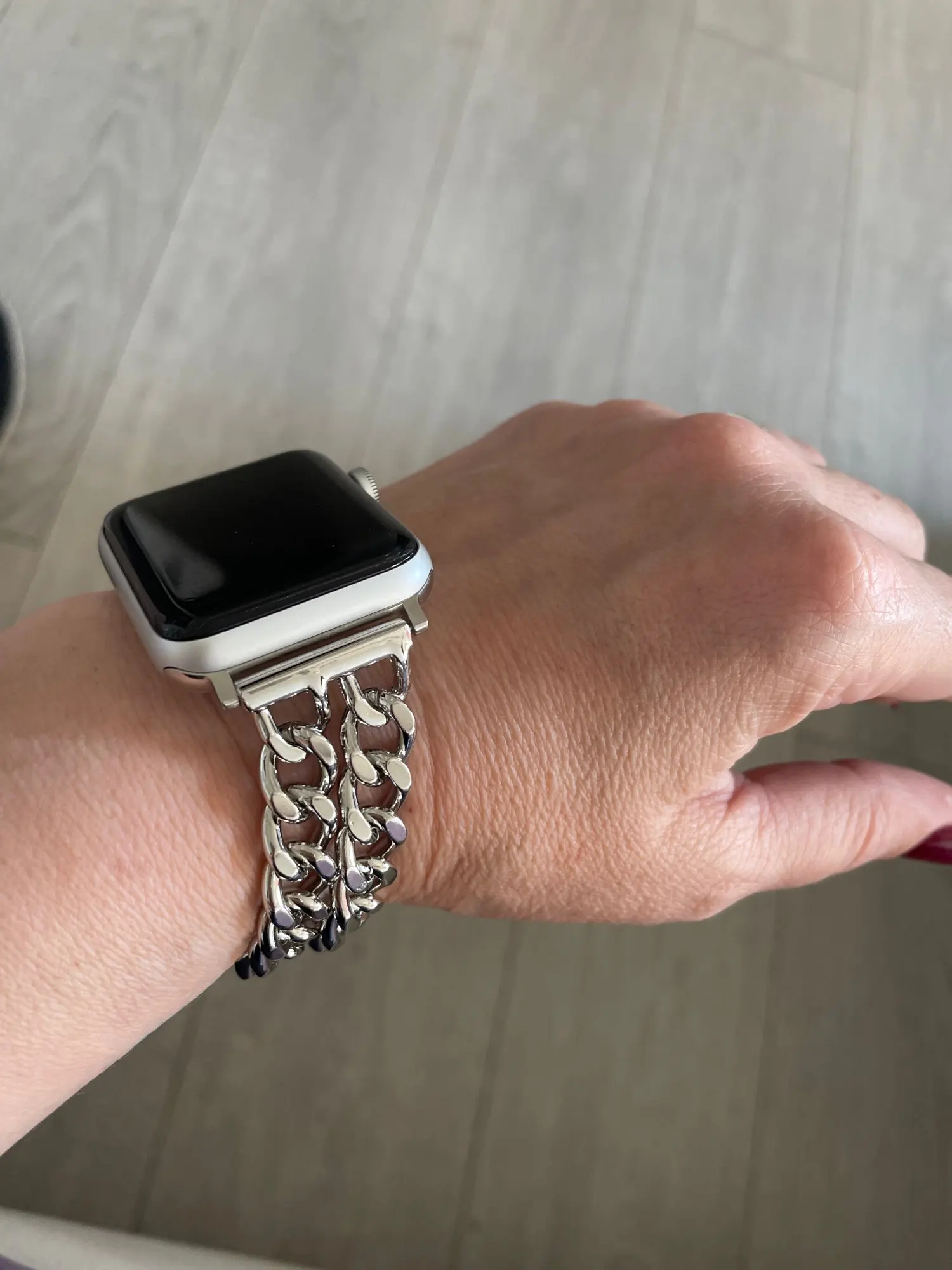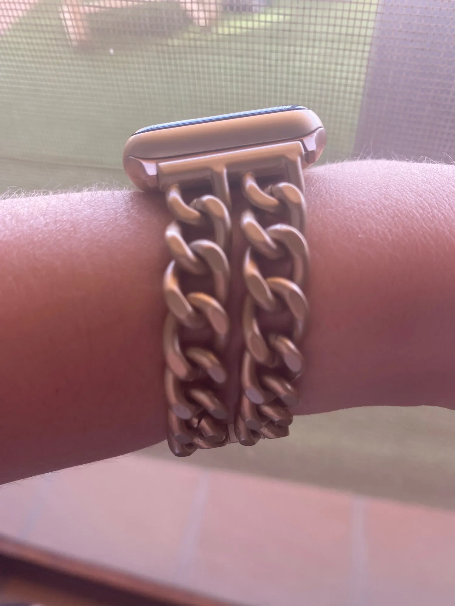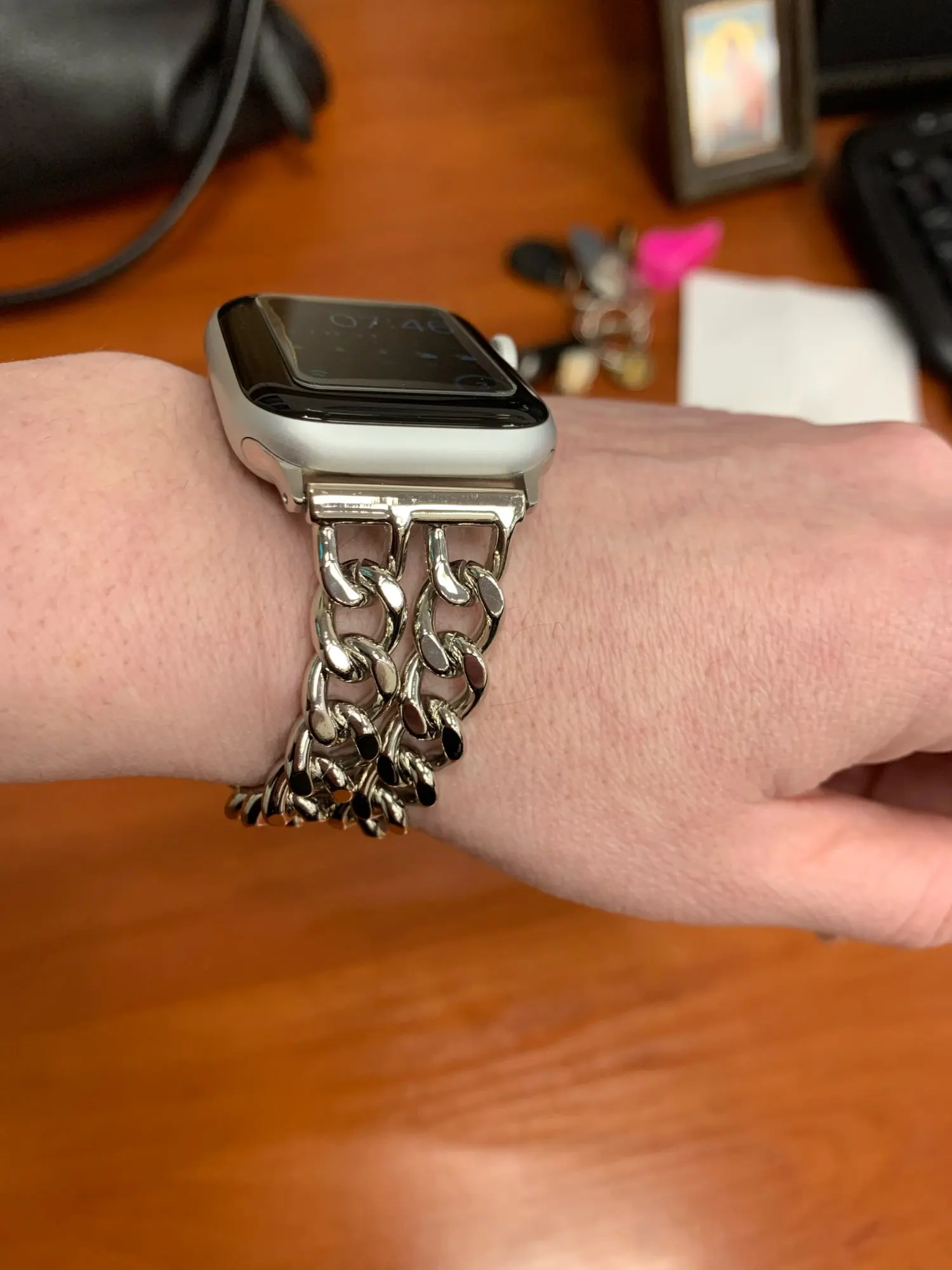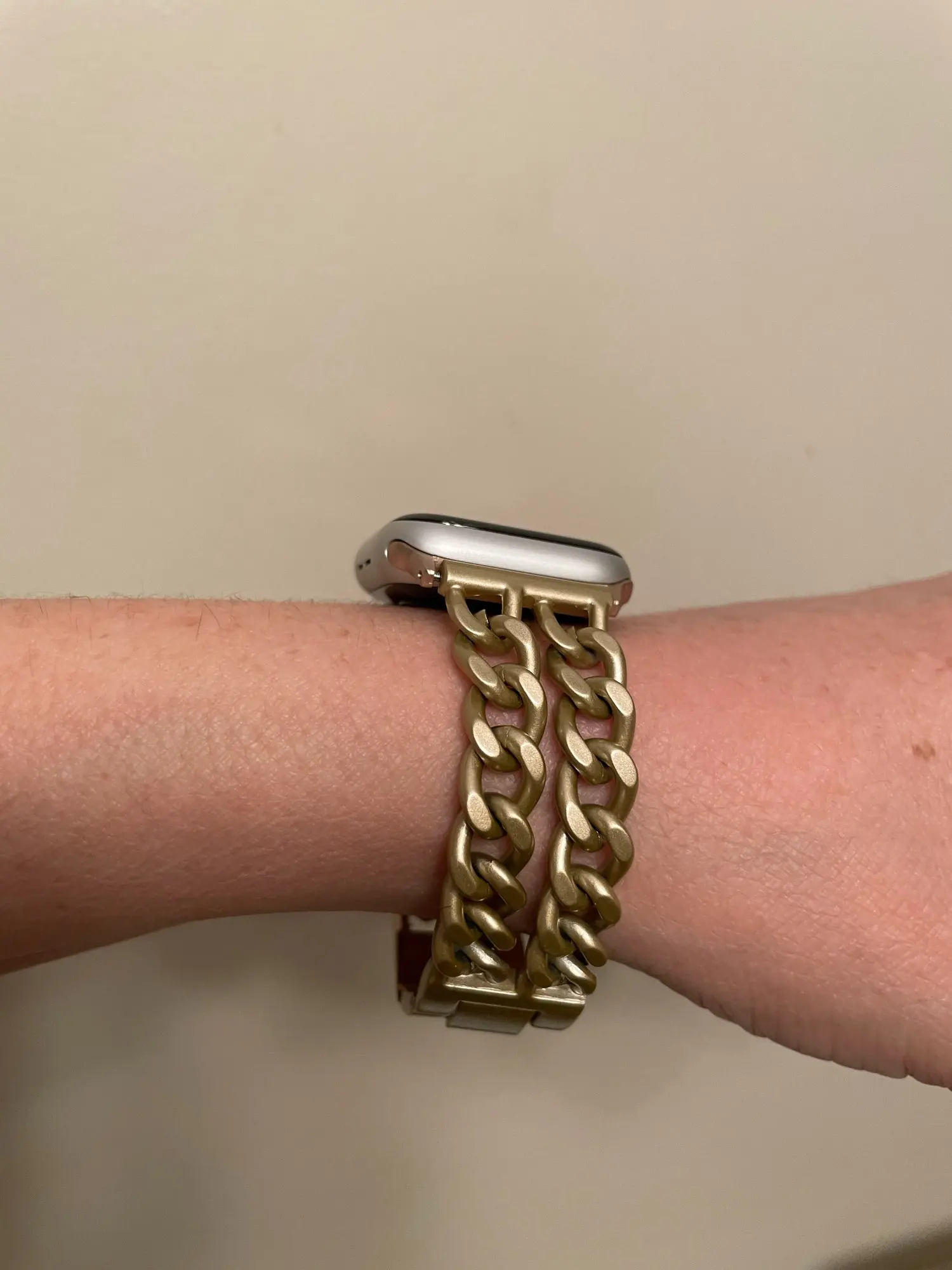 Очень крутой ремешок! Первый раз решила заказать через Пятерочку и мне заказ дошёл за 10 дней!!! (Свердловская область). Обычно такая мелочь почтой идёт по 2-3 месяца, буду сейчас всегда заказывать так. Муж весь вечер убирал мне звенья))) у меня просто ооооочень худая рука. Заказывала на iwatch 4 44mm. С каждой стороны убрали по 2 звена, щас сидит идеально!