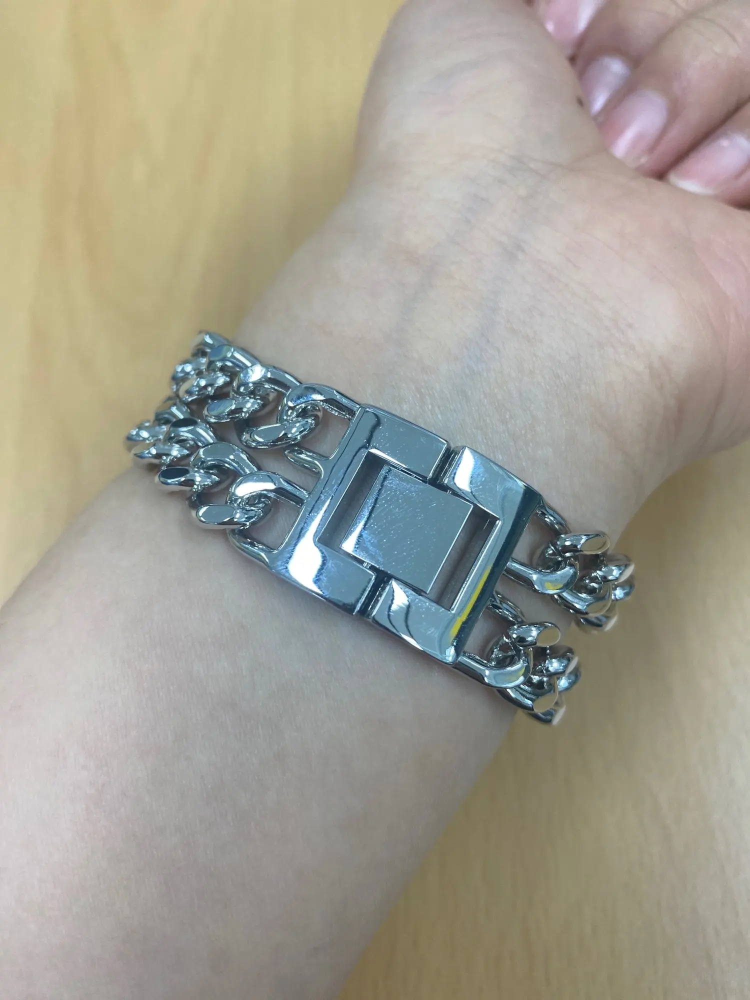 Доставка была в магазин Пятёрочка, пришёл браслет быстро. Смотрится, конечно, здорово, но только бракованный. Одна часть с цепями, которая вставляется в часы, установлена правильно, а вторая перевёрнута. Пришлось самим ковыряться. На узкую руку не лучший вариант. Мне пришлось убрать все звенья с застёжкой (крупные) и ещё убирать по одному звену цепочки с каждой стороны. В остальном браслет классный.