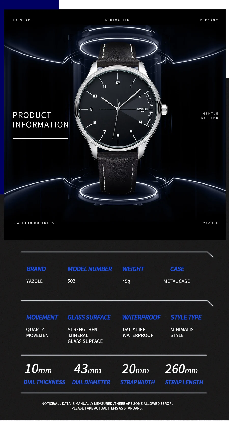 Мужские кварцевые часы YAZOLE, водонепроницаемые, 502, 2019