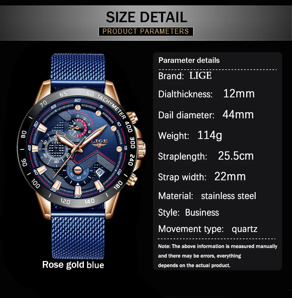 LIGE новые часы. Полностью синий сетчатый золотой чехол. Это стильные деловые часы и часы для отдыха. С хронографом, автоматическим календарем, водонепроницаемым, противоударным, светящимся и другими функциями; Подходит для всех случаев. Ключевые особенности: -100% новый ярлык и высокое качество; Топ бренд класса люкс Высокое качество дизайн циферблат, функция отображения даты; Механизм: кварцевый механизм с временным модулем (Сделано в Японии) с точным временем в пути и сроком службы 2 года -3 АТМ/30 М Водонепроницаемость (поддерживает душ и плавание в холодной воде, не работает под водой, не поддерживает горячую воду); -Из нержавеющей стали (Не беспокойтесь о ржавчине, выцветании) (Не беспокойтесь, что сетчатый пояс поцарапает вашу руку) (Анти-шок, анти-падение, Анти-Царапины) Q & A область: Является ли изображение таким же, как на самом деле? Да, это настоящая сцена, взятая в соответствии с физической картой продукта. Маленькие циферблаты могут работать? Или это просто украшение? Поэтому нормальная работа маленького циферблата не является орнаментом, его можно использовать в реальной жизни, и он имеет функцию водонепроницаемого и светящегося. Как насчет своевременности доставки? Это займет много времени, чтобы приехать? Мы обработаем доставку заказа в течение двух дней, с нормальным временем доставки от 20 до 30 дней. , Время транспортировки быстрое Посылка включает в себя: -100% новый бренд -Часы LIGE-1 шт. -1 оригинальная подарочная коробка -1 х протрите