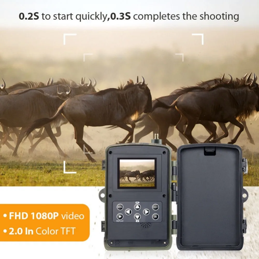 -120 градусов 1080P HD PIR сенсор камера, поддержка 16MP / 12MP / 8MP / 5MP / 3MP Выбор разрешения изображения, 1080P 30fps видео. Инфракрасная камера для съемки диких животных.-1 / 5 / 10 / 30 секунд/минут интервал между движениями по желанию. Камера может быть запрограммирована для работы в режиме PIR или в режиме time-lapse.-ИК-вспышка для цветного фото/видео дня или черно-белого фото/видео в ночное время. HD видео (1080P) со звуком.-Реальная температура, время и дата должны быть штампованы на картинке, так что вы знаете, когда фотография или видео были сделаны.-36 ИК-светодиодов, сверхдальний диапазон обнаружения до 20 м/66 футов. Триггер время 0,3 s, быстро огонь серийную съемку, никогда не пропустите ни одного важного картину.-IPX65 герметичный водонепроницаемый внешний вид, эффективно предотвращает попадание пыли и насекомых в дождевую воду.-Поддержка Micro SD карты/USB / AV выход (Micro SD карты не включены).-Отличный инструмент для охоты, путешествий, кемпинга, отслеживания домашних/диких животных. Простота в использовании и креплении.-Это может быть вызвано любым движением человека (или животных) в определенной области, контролируемой датчиком движения.-Инфракрасный пульт является входным устройством камеры и в основном используется для настройки клиента. Максимальное расстояние дистанционного управления составляет 20 метров.-С фиксированной веревкой с пряжкой, легко крепится к стержням дерева и веткам дерева.Параметр:Датчик изображения: 8 мегапикселей Цвет CMOSПамять: TF карта до 32 ГбОбъектив: F = 3,1; FOV = 90 градусовДисплей: 2,0 inch на тонкопленочных транзисторах на тонкоплёночных транзисторахРежим: камера/видео/камера и видео/промежуток времениДиапазон обнаружения PIR: 120 градусовРасстояние ночного видения: 65 футов/20 метровIR светодиодный: 36 infared светодиодный sРадиус действия PIR: 65ft / 20 метровСкорость запуска: 0,3 во-вторыхPIR интервал: 1 / 5 / 10 / 30sec/мин (по умолчанию 1 сек)Разрешение изображения: 16 МП/12 МП/8 МПНесколько фотографий на одном обнаружении: 1 / 3 / 6 / 9Разрешение видео: 1080P / 720P / WVGA / VGAФормат файла: JPEG / AVIДата и время печати: даОтпечаток фазы Луны: ДаISO Экспозиция: Авто/100 / 200 / 400Пароль безопасности: 4 цифровой PIN-кодТок: 0.2маВремя работы: 6 месяцевИнтерфейс: выход ТВ; USB2.0; Карта Micro SD; Внешний разъем 6 В/АСпособ фиксации: ремень, крепление штативаОбнаружение движения: низкий/средний/высокийРабочая температура: -20 - 70 градусов по Цельсию (-4 - 158 градусов по Цельсию)Питание: 8 x AA или 4 x AA батареи (не входят в комплект)Таймер: ДаВодонепроницаемость: IP65Язык: En / FR / DE / ES / RU / DK / NL / PL / PT / SE / IT / FIСертификат: FCC, CE, RoHS