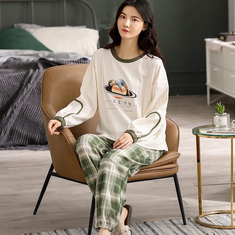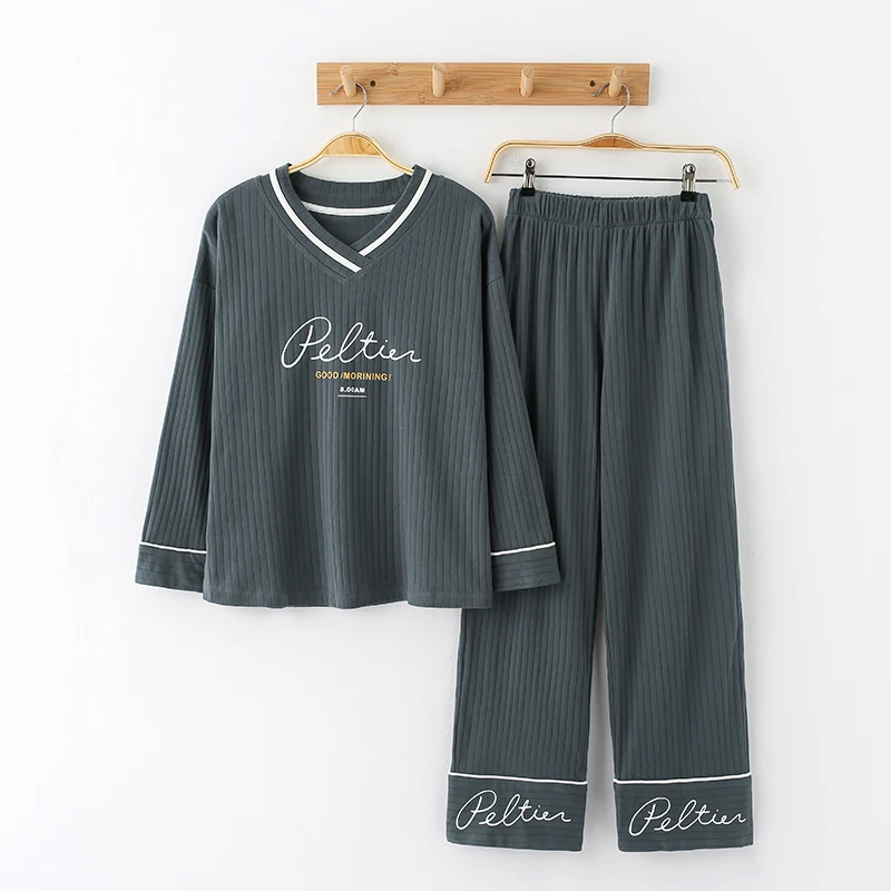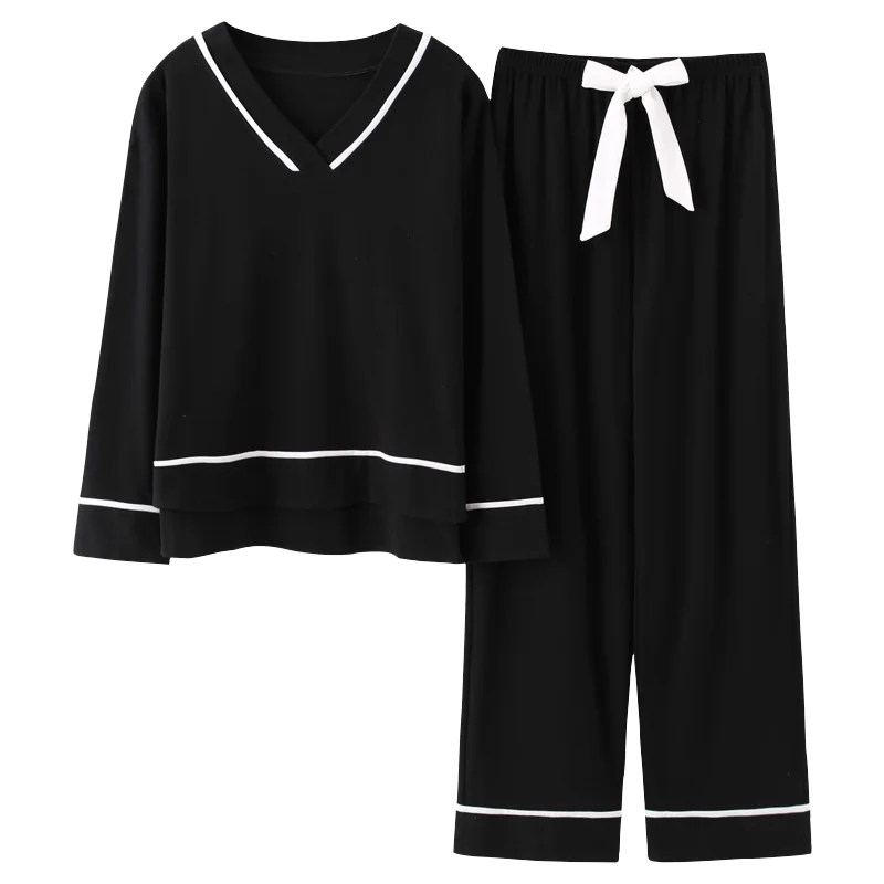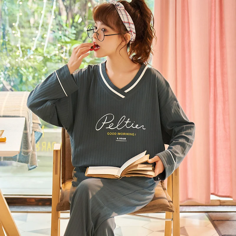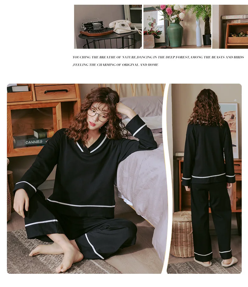 Пижама женская хлопковая, с длинным рукавом и V-образным вырезом