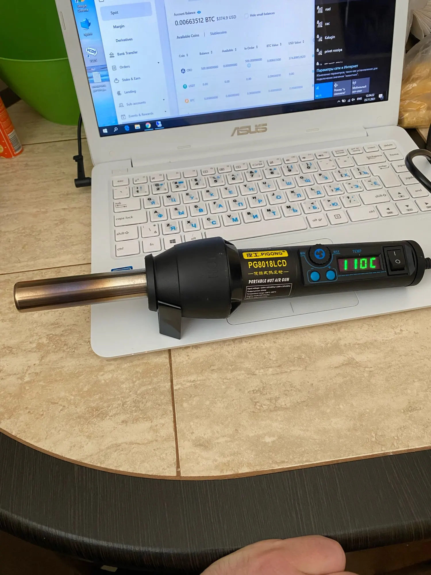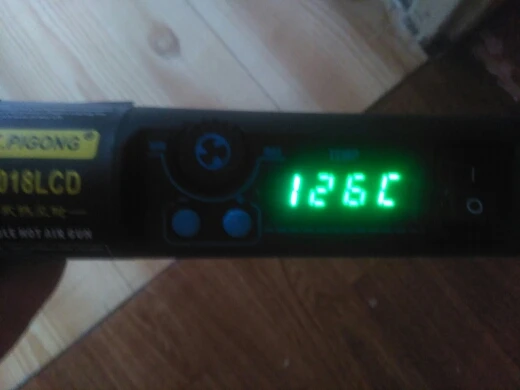 Греется быстро, кулер выключается при охлаждении ниже 100С .Не понравилось, что запасной нагревательный элемент просто подсунут под ручку, слюда страдает. Поток воздуха мог бы быть и посильнее, толстую плату не греет. Для мелких работ.