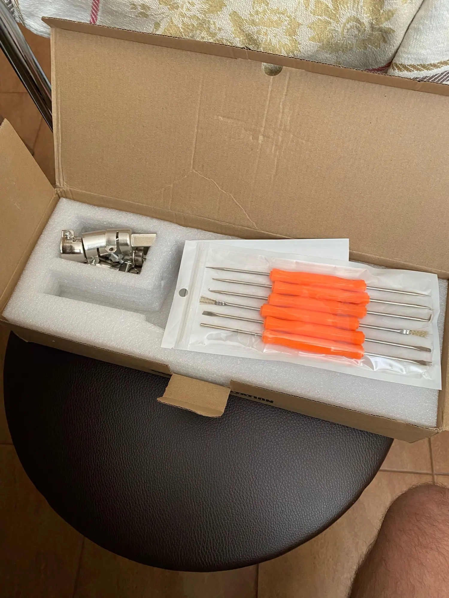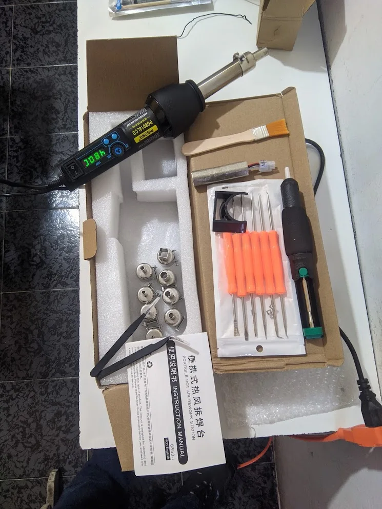Паяльный фен шикарный, регулировка температуры и напора воздуха, индикатор включения в розетку, включаешь тумблер и пошла жара. По итогу выключаешь…а фен ещё дует, пока не охладится до безопасной температуры не выключается(и вам не рекомендую выключать). В комплекте гора, прям гора насадок(сопла), оловоОтсос, запасной нагревательный элемент, два пинцета. У меня ещё были приспособы с оранжевой ручкой по середине(пачка разных). Качество сборки на высоте, провод питания толстенный.