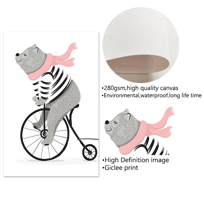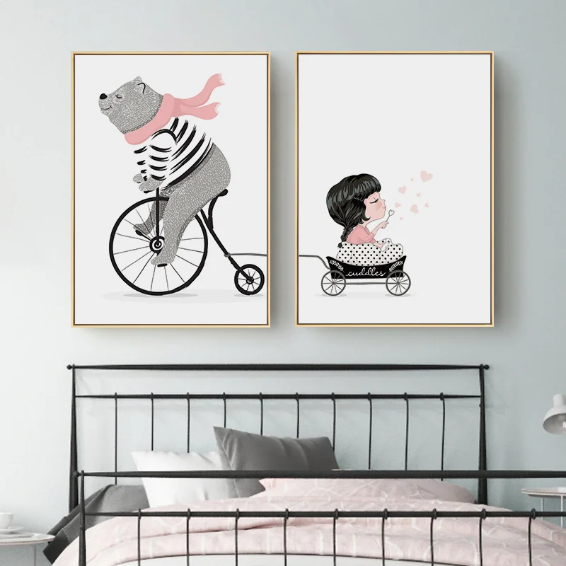 Мультяшный медведь, езда на велосипеде, скандинавские постеры для девочек, печать, холст, картина для детской спальни, Настенная картина, декор для детской комнаты