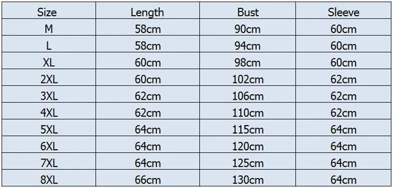 Это Азиатский Размер, пожалуйста, проверьте размер s в таблице размеров перед покупкой! M: Длина: 58 см бюст: 90 см рукав: 60 см L: Длина: 58 см бюст: 94 см Рукав: 60 см XL: длина: 60 см бюст: 98 см рукав: 60 см XXL: длина: 60 см бюст: 102 см рукав: 62 см 3XL: длина: 62 см бюст: 106 см рукав: 62 см 4XL: длина: 62 см бюст: 110 см рукав: 62 см 5XL: длина: 64 см бюст: 115 см рукав: 64 см 6XL: длина: 64 см Бюст: 120 см рукав: 64 см 7XL: длина: 64 см бюст: 125 см рукав: 64 см 8XL: длина: 66 см бюст: 130 см рукав: 64 см Примечание: 1. Поскольку разные компьютеры отображают цвет s по-разному, цвет фактического товара может незначительно отличаться от изображения! 2. Брюки будут сокращены на 2-4 см после стирки, пожалуйста, учитывайте погрешность в размере 3-4 см! 3. Фото модели только для справки. Пожалуйста, выберите реальные объекты в качестве стойки!