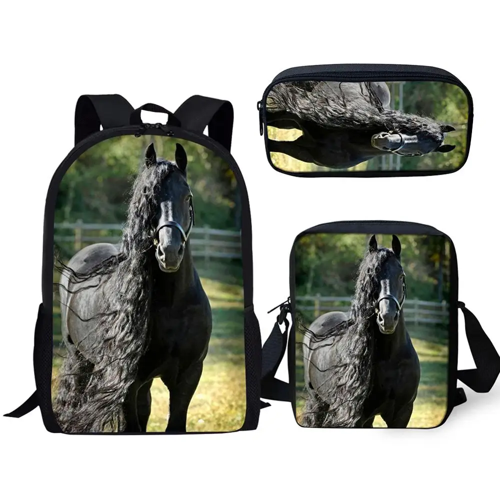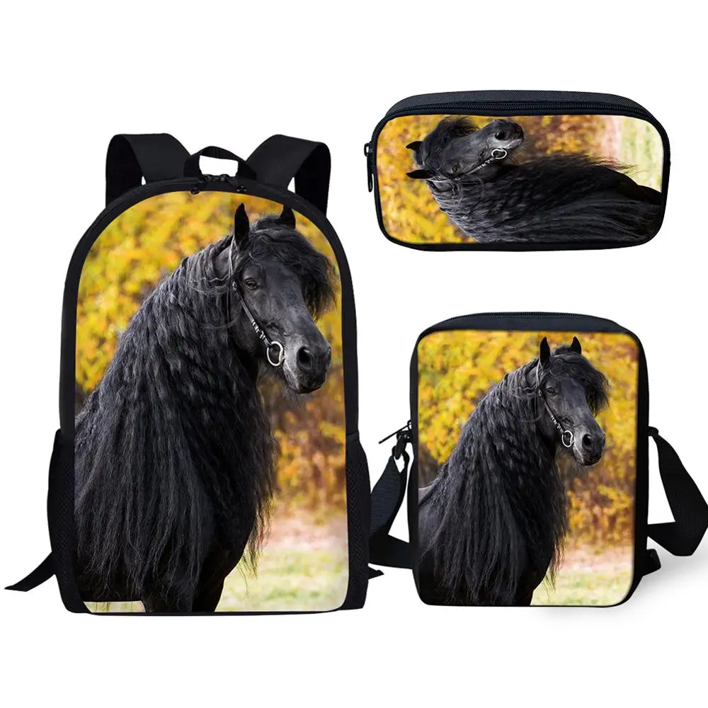 HaoYun 3 шт.компл. красивый черный Принт лошади школьные ранцы для мальчиков подростков девочек Фризские рюкзаки с рисунком лошади студенческий дорожный рюкзак