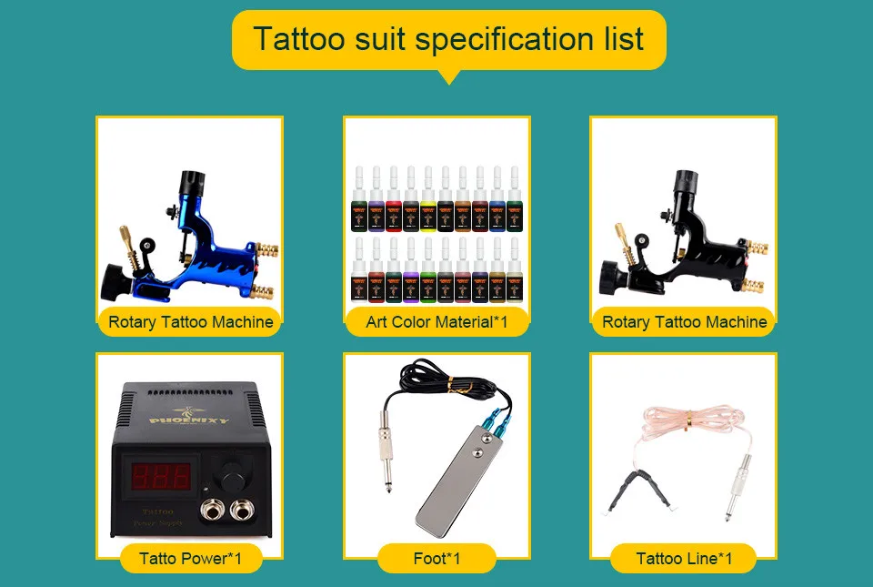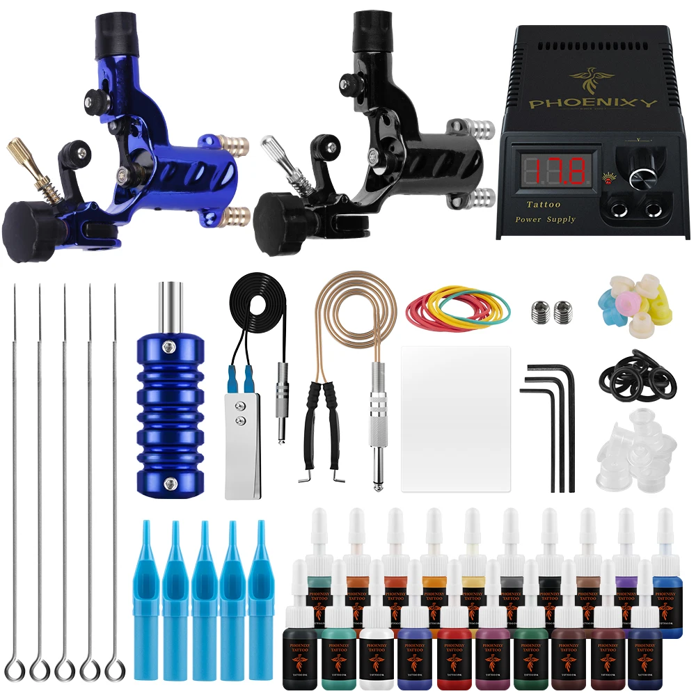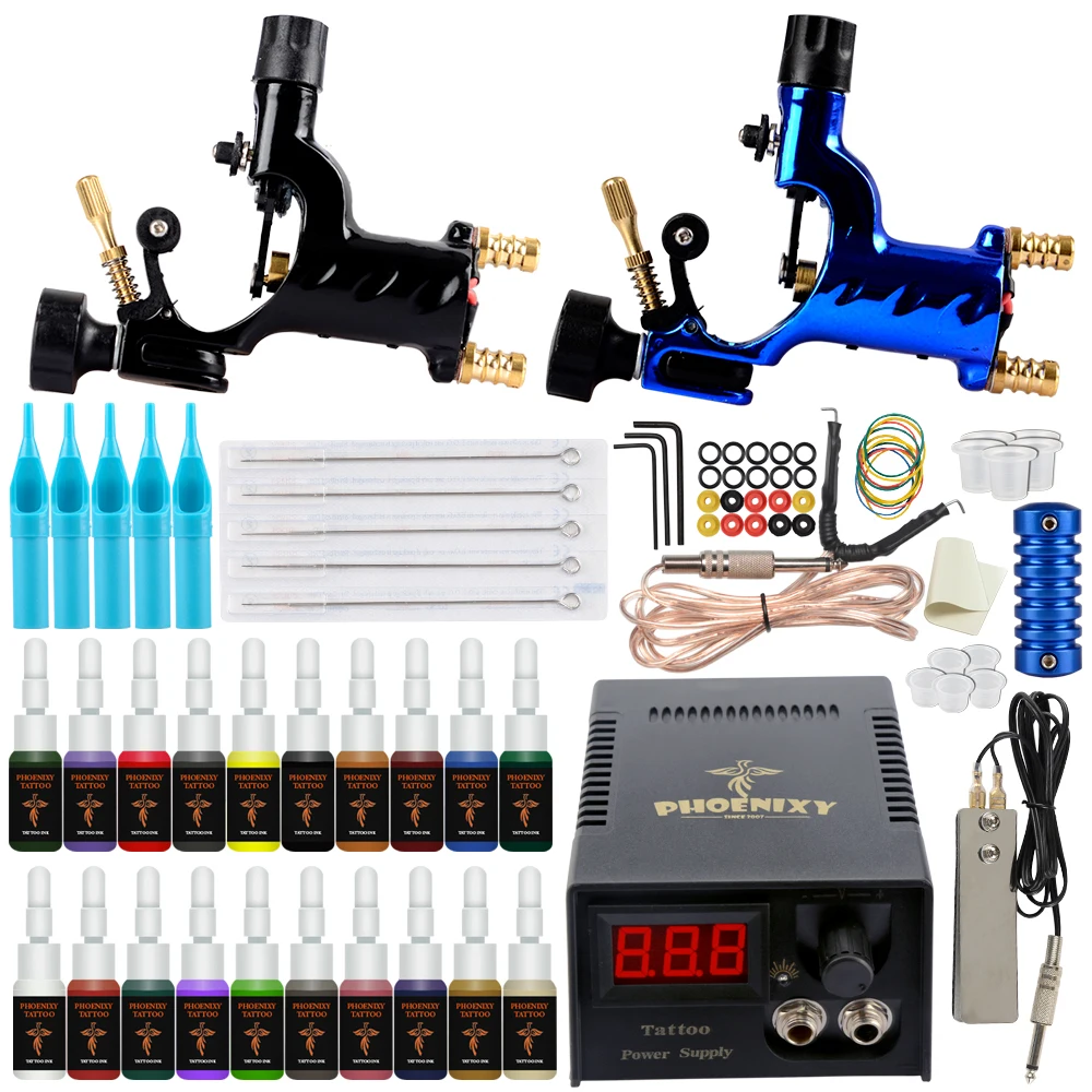 1 х Черная роторная тату-машина1 xBlue роторная тату машина1 xlcd большая птица Питание Системы1 х шнур питания1 x зажим шнур1 X ножной переключатель5xTattoo иглы (5RL)5x5R синие одноразовые татуировки иглы Советы1 X Высококачественная синяя ручка для тату10 x втулка держит иглу устойчивой10 x резиновых полос Avoide машина10 x уплотнительное кольцо уверенная пружина гладкая3 x набор инструментов регулировки для машины10X цветных чашек1 X моделирование кожи20x5 мл 20 цветов тату чернила