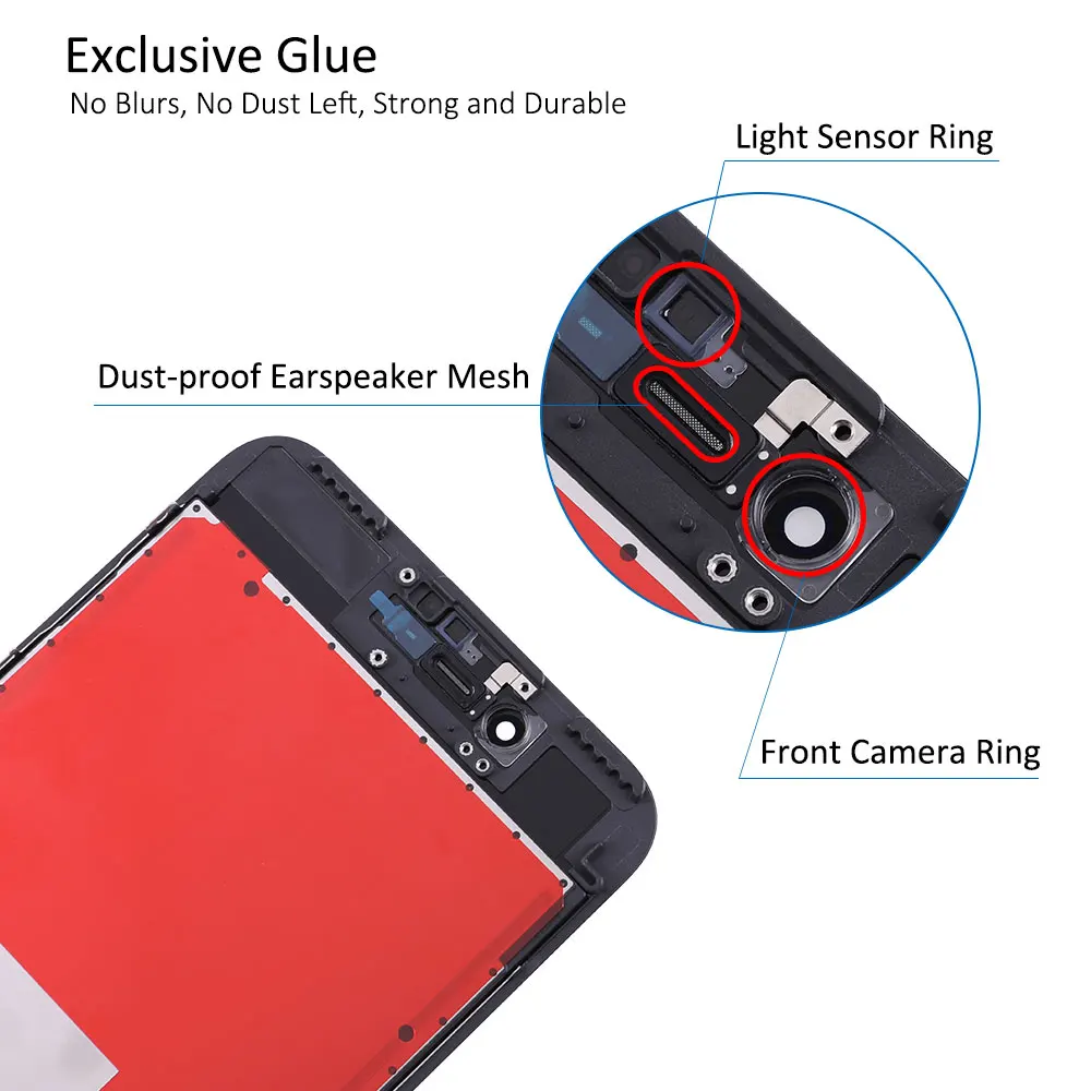 1. Детали: внешнее стекло + ЖК-экран + сенсорная панель дигитайзера + Переднее кольцо для камеры + Датчик-светильник + Пыленепроницаемая сетка для ушей, предварительно собранная.2. Материал: пластик подходит для iPhone 5/7/7Plus/8/8Plus3. Контроль качества: Каждый экран был протестирован перед отправкой и работает на 100%.4. Посылка: поставляется с антистатической сумкой + пузырчатой сумкой, безопасной упаковкой.5. Гарантия: мы предлагаем пожизненную гарантию (гарантия аннулируется, если ЖК-дисплей/гибкий кабель/Рама повреждена после установки или во время установки).