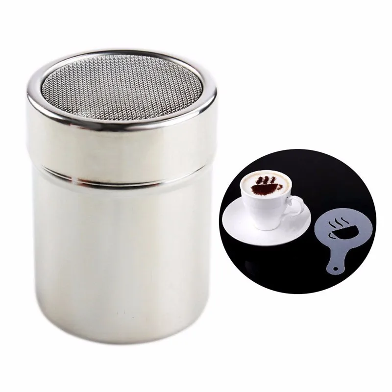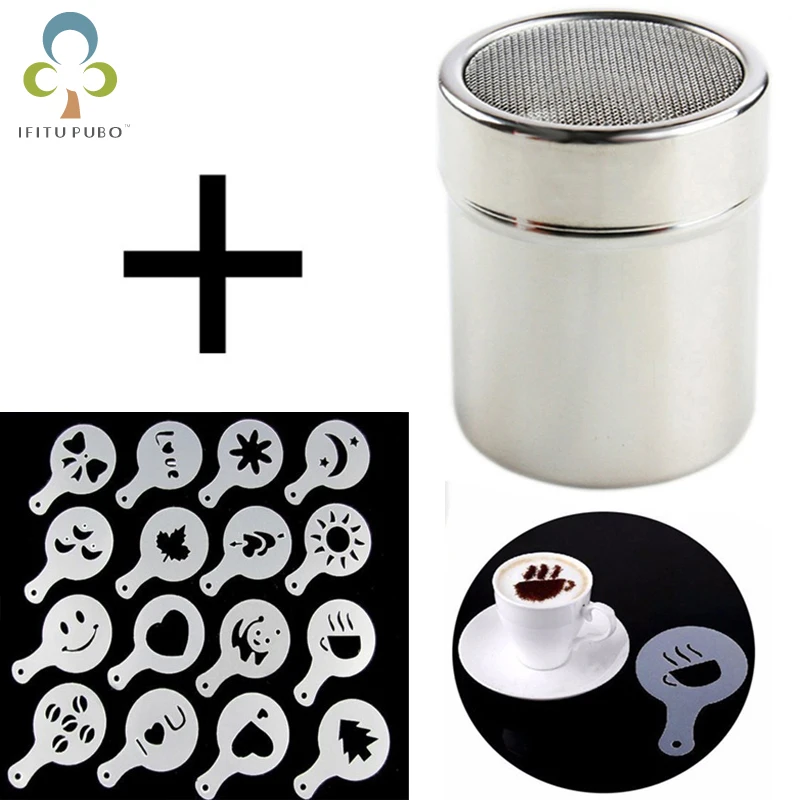 Просеиватель шейкер для кофе и шоколада какао, 1 шт., нержавеющая сталь, мучной кофе, + 16 шт. шаблонов для кофе, Strew подушка в цветочек, спрей, инструменты для кофе ZXH
