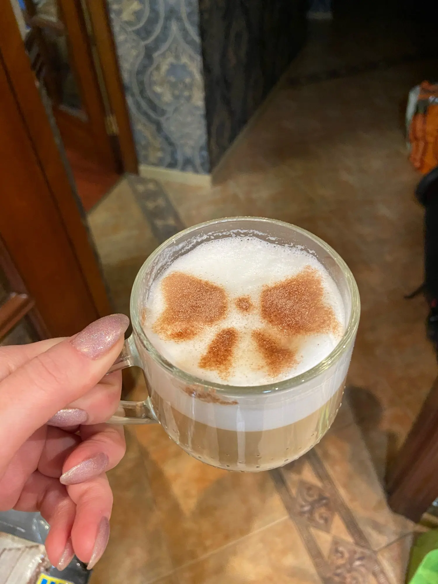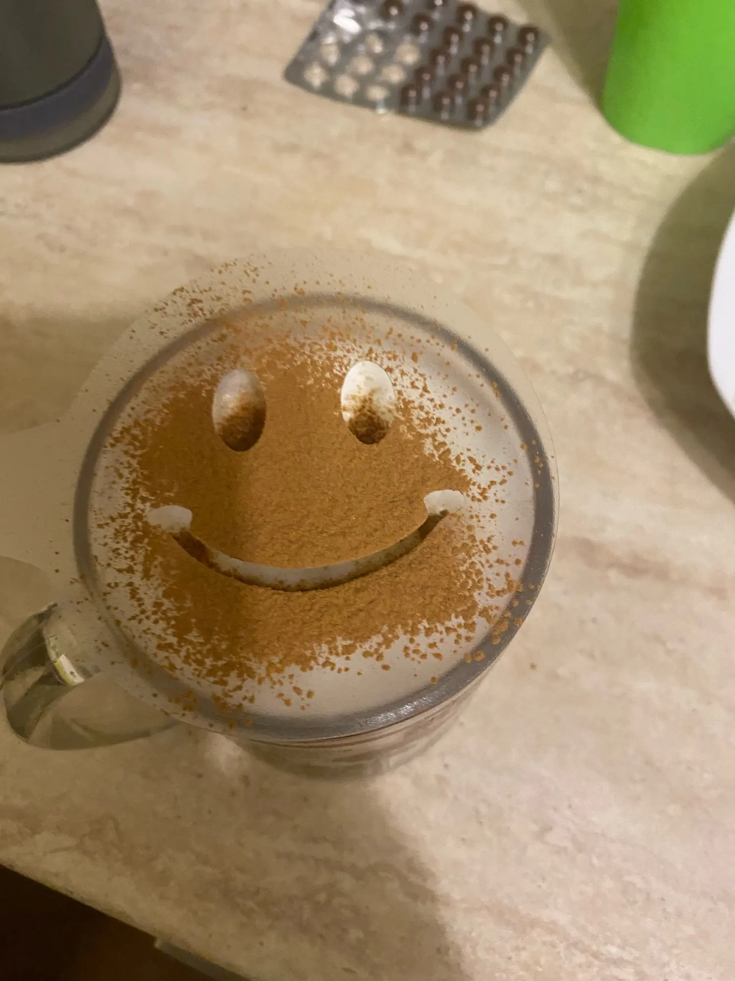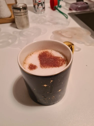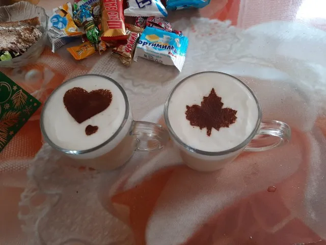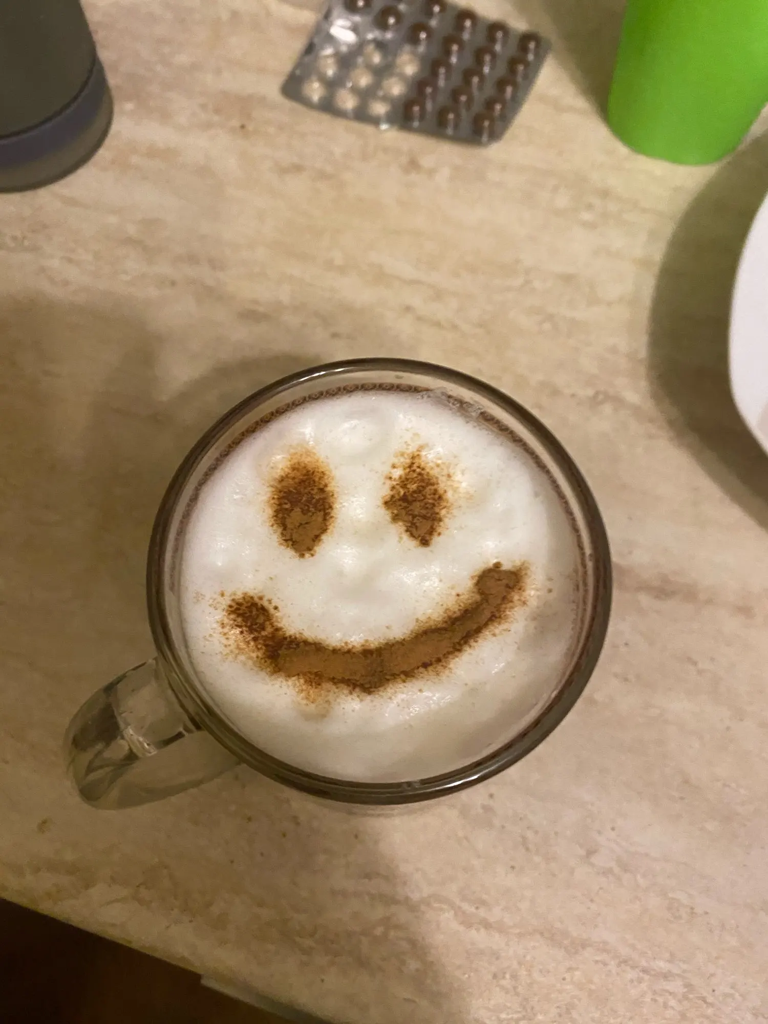Вот мой первый тест. Уровень пены молока должен быть очень близко к краю, но без прикосновения к трафарету, размещенной на чашке. Простые цифры (смайлик, дерево...) рекомендуются для начала. Я проверю более развитые цифры, когда буду немного лучше контролировать.