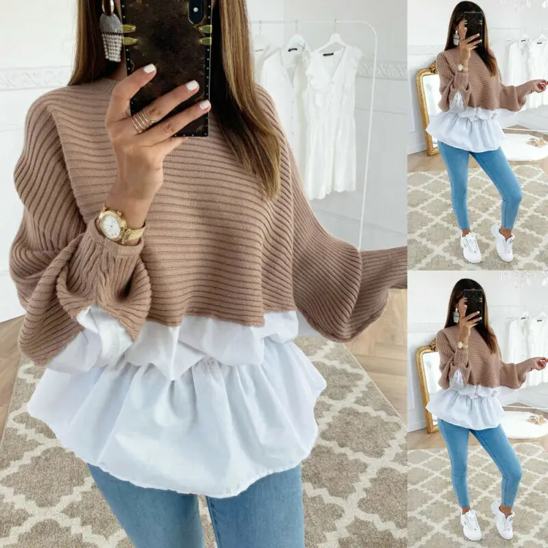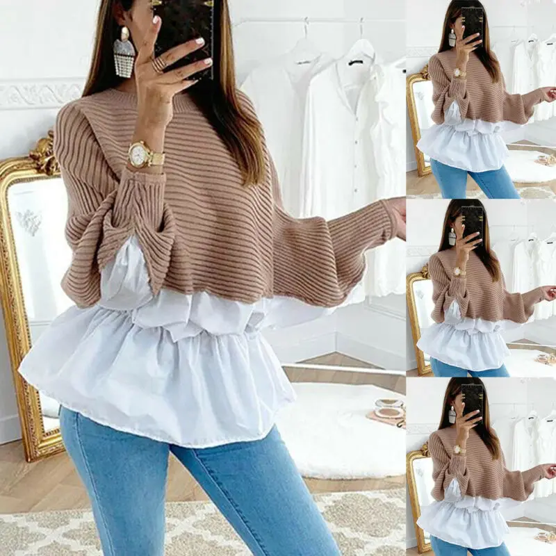 Женская блузка осень длинный рукав вязаный, с круглым вырезом пуловер блузка повседневные женские топы Лоскутные женские блузки, рубашки, топы
