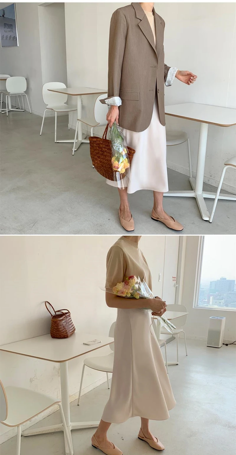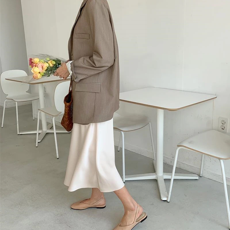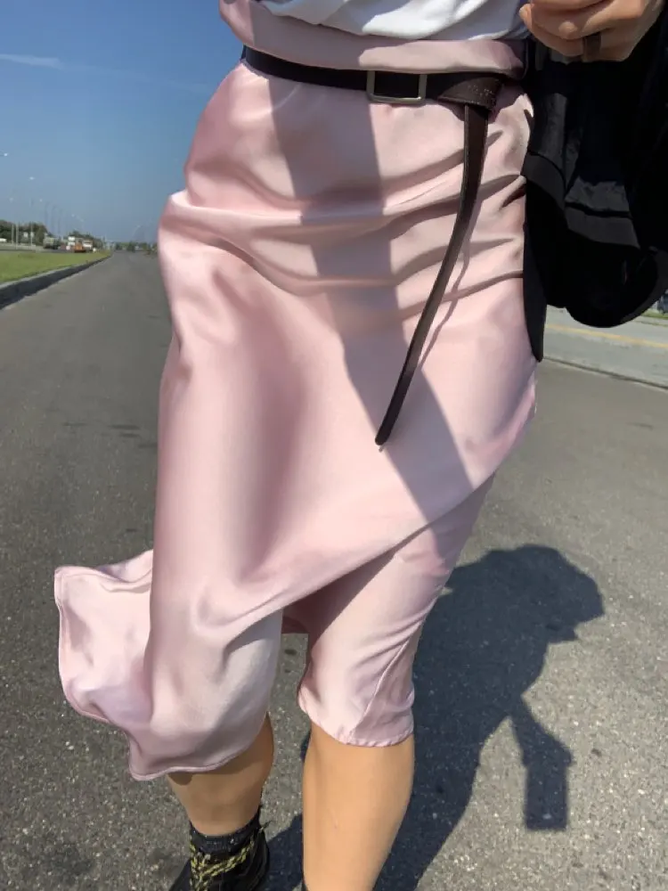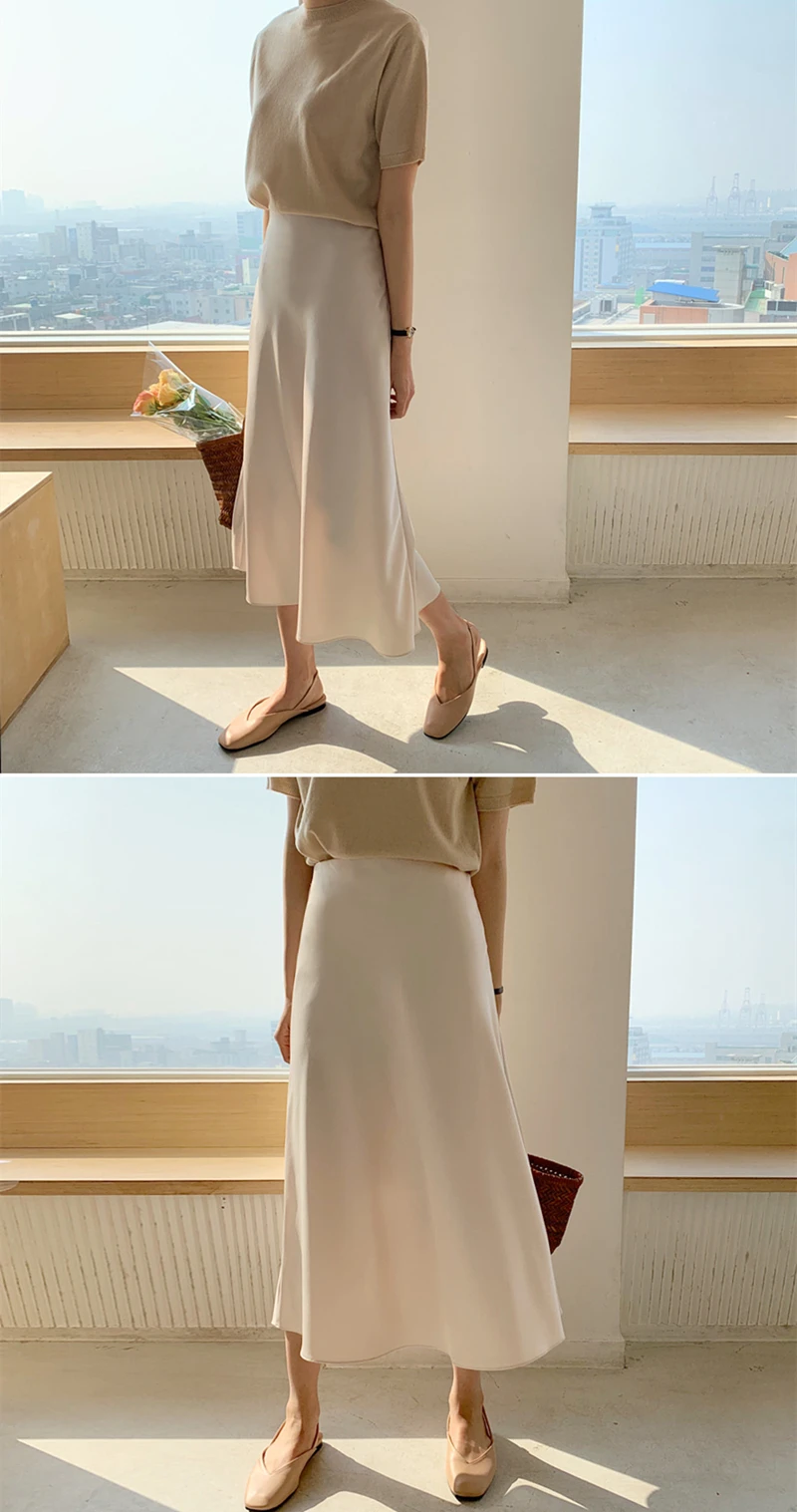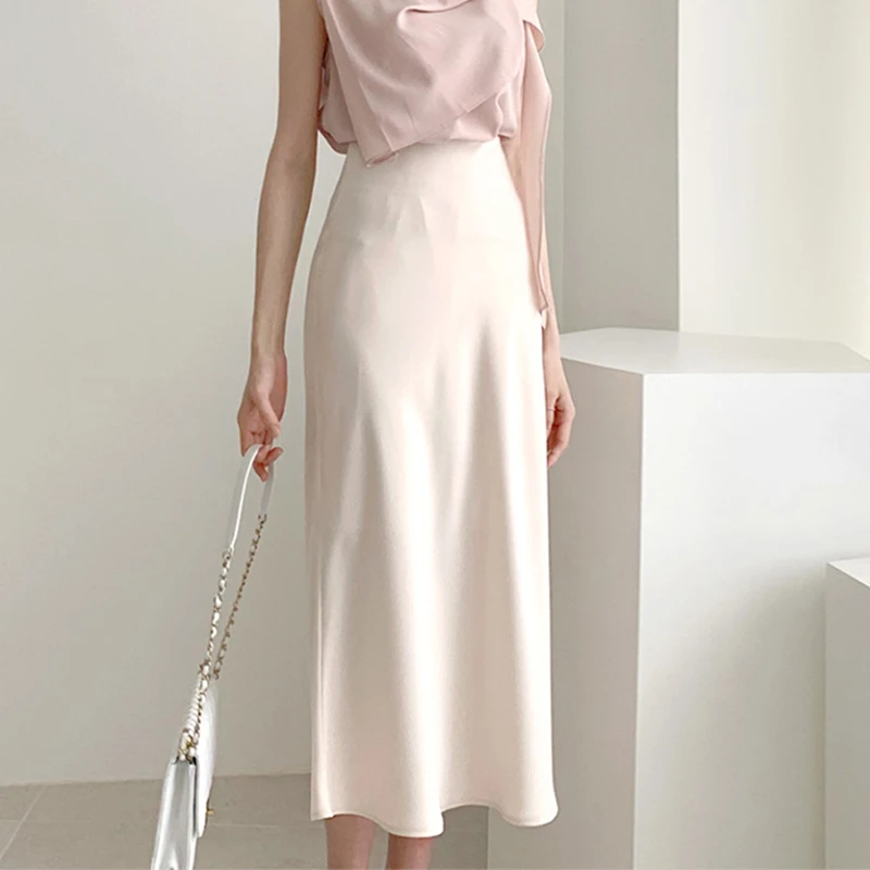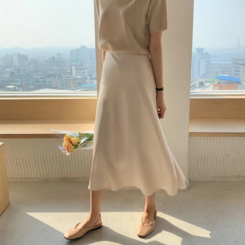 Летняя и весенняя женская Элегантная атласная юбка с высокой талией, Женская Повседневная шелковая юбка-трапеция средней длины