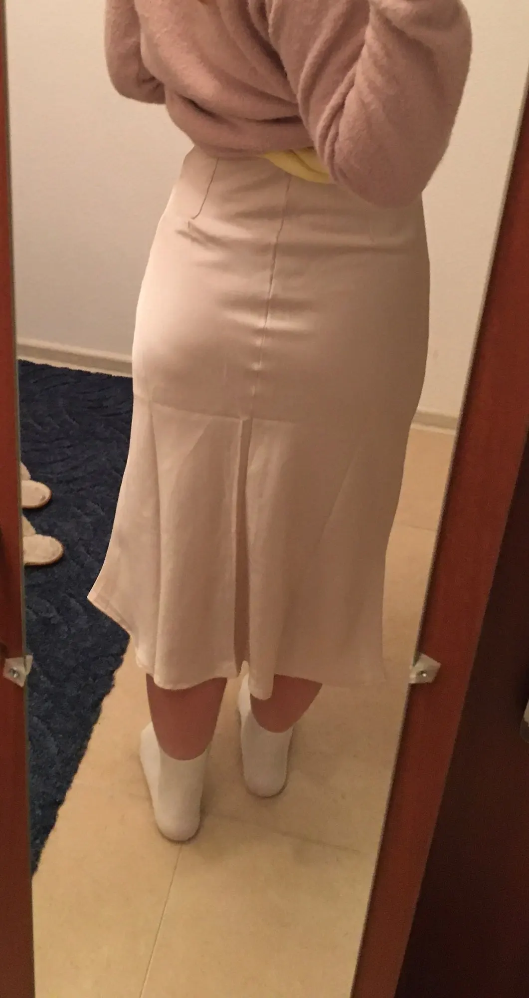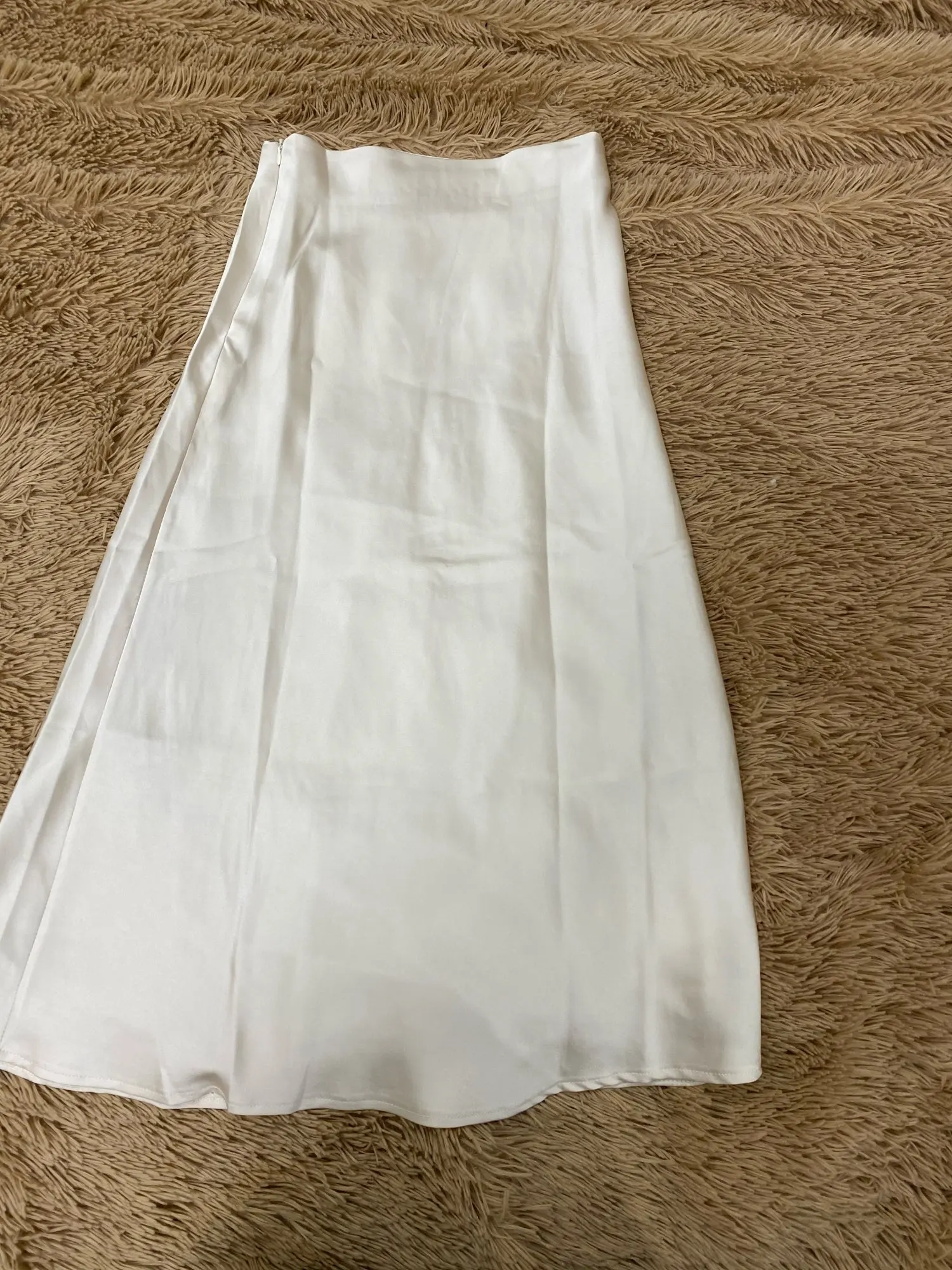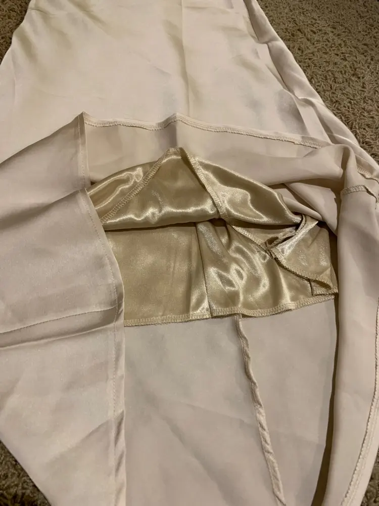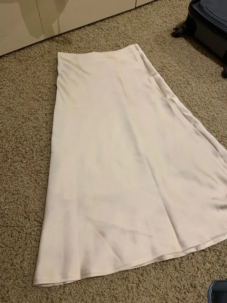 Продавец отправил товар только через 12 дней после оплаты. До Петербурга юбка шла чуть меньше месяца. Спереди складка на подкладка, которая некрасиво выпирает сквозь шелк. Молния справа, а не слева или сзади. Молния пришита так, что ткань топорщится, это немного портит общий вид. Атлас стрейч, немного тянется.