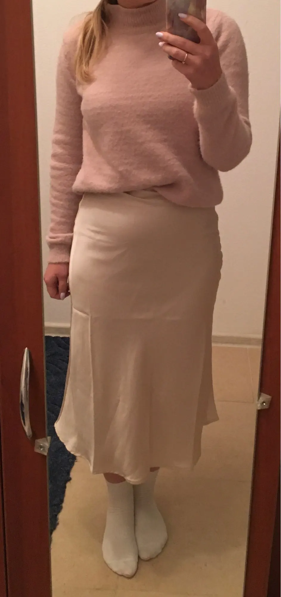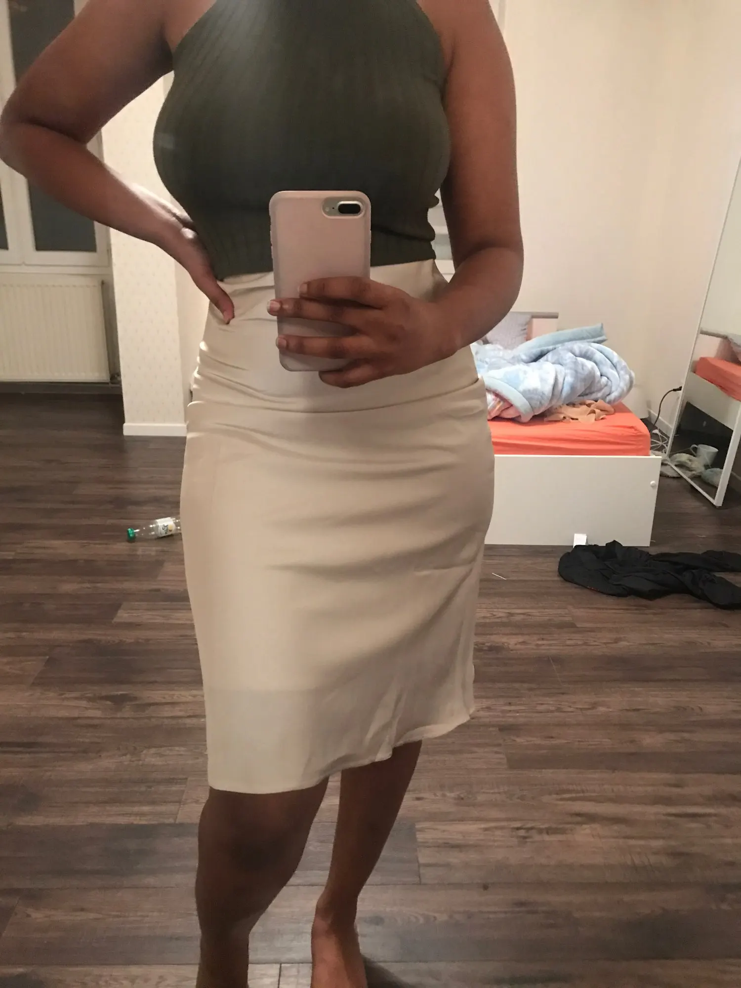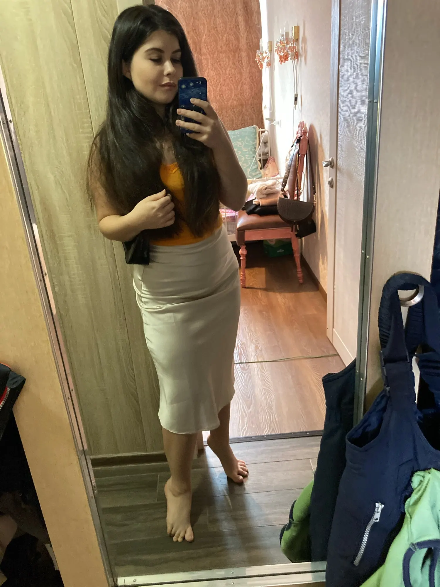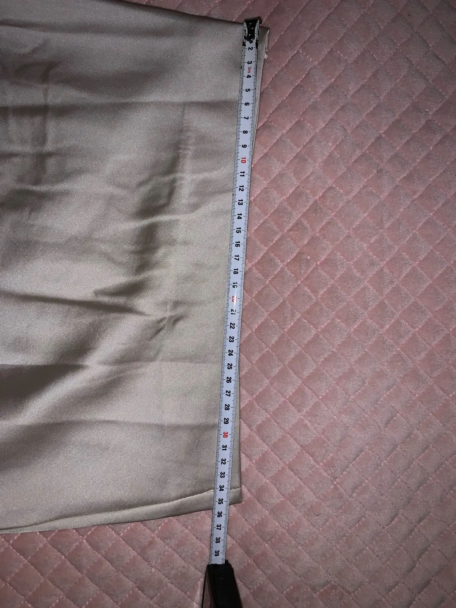 Продавец отправил товар только через 12 дней после оплаты. До Петербурга юбка шла чуть меньше месяца. Спереди складка на подкладка, которая некрасиво выпирает сквозь шелк. Молния справа, а не слева или сзади. Молния пришита так, что ткань топорщится, это немного портит общий вид. Атлас стрейч, немного тянется.