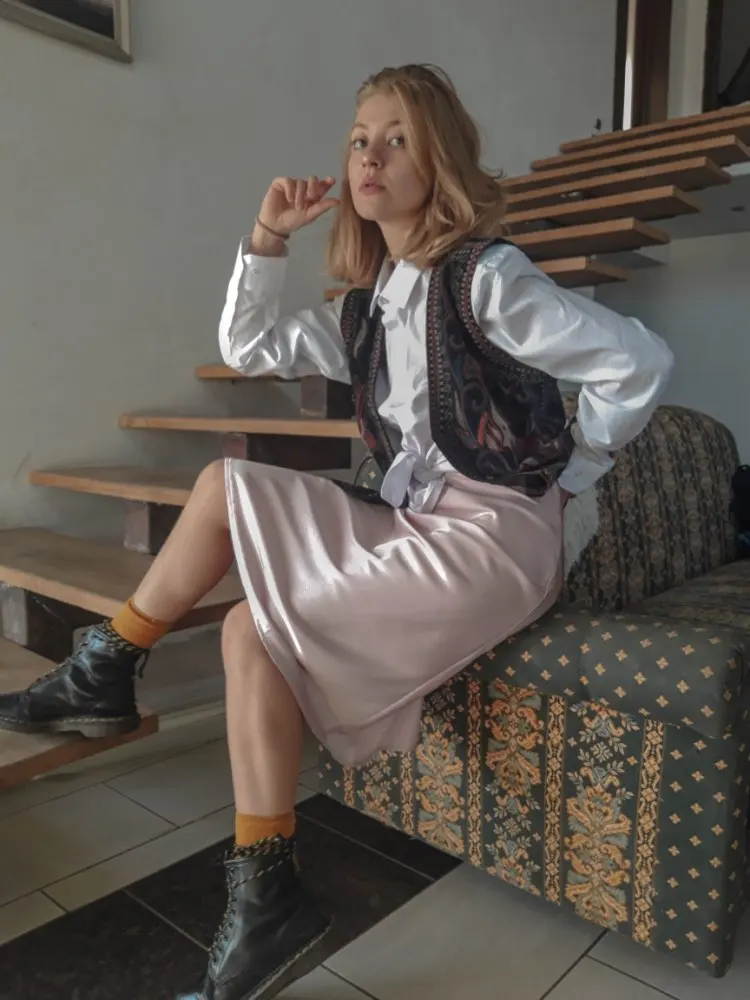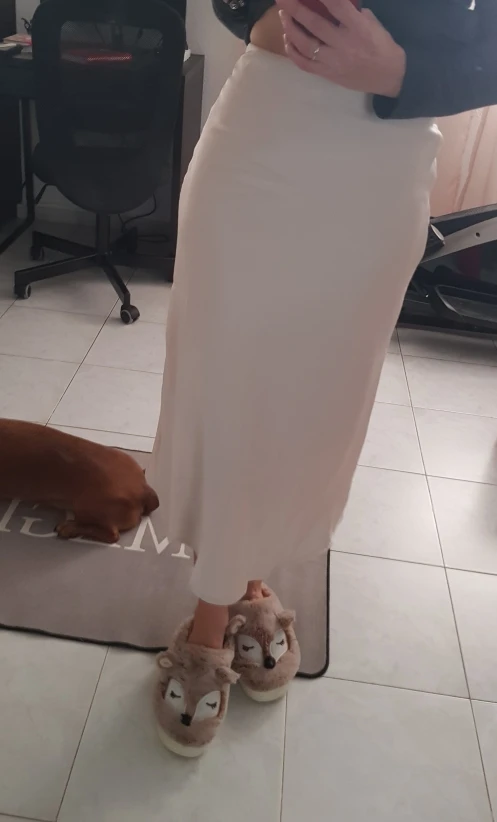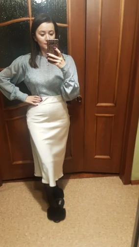 Поначалу немного расстроилась, что юбка довольно плотная (получала ещё когда было тепло). Но сейчас, когда на улице похолодало, не могу нарадоваться покупке. Конечно, она так не струится, как юбки из более тонкой ткани, но все равно смотрится очень достойно. Пошита хорошо и блеск благородный, не пластмассовый. Рекомендую
