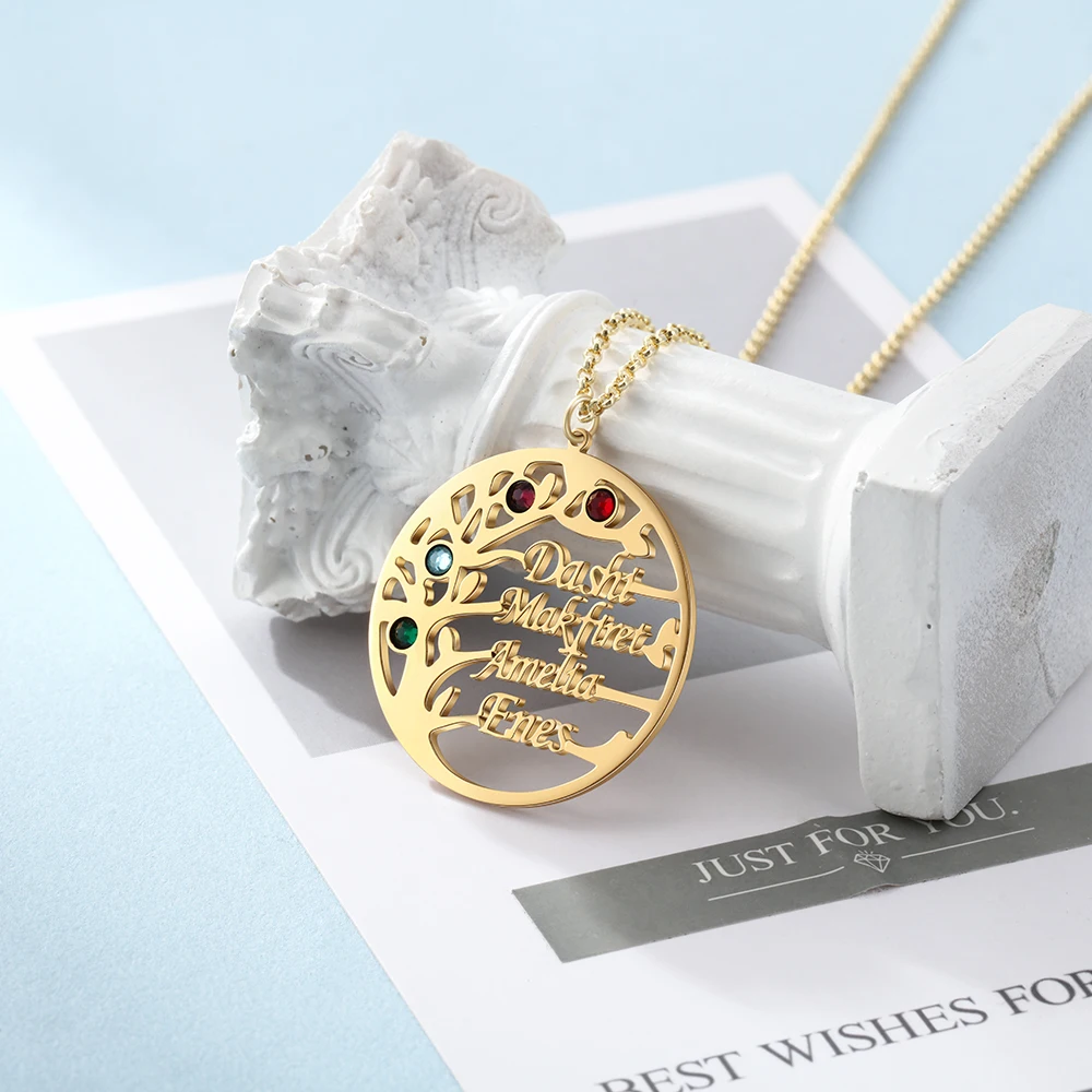 Ожерелье с 4 камнями по индивидуальному заказу, семейное древо жизни, круглая подвеска, именная табличка, ожерелья, персонализированные подарки для матери, бабушки
