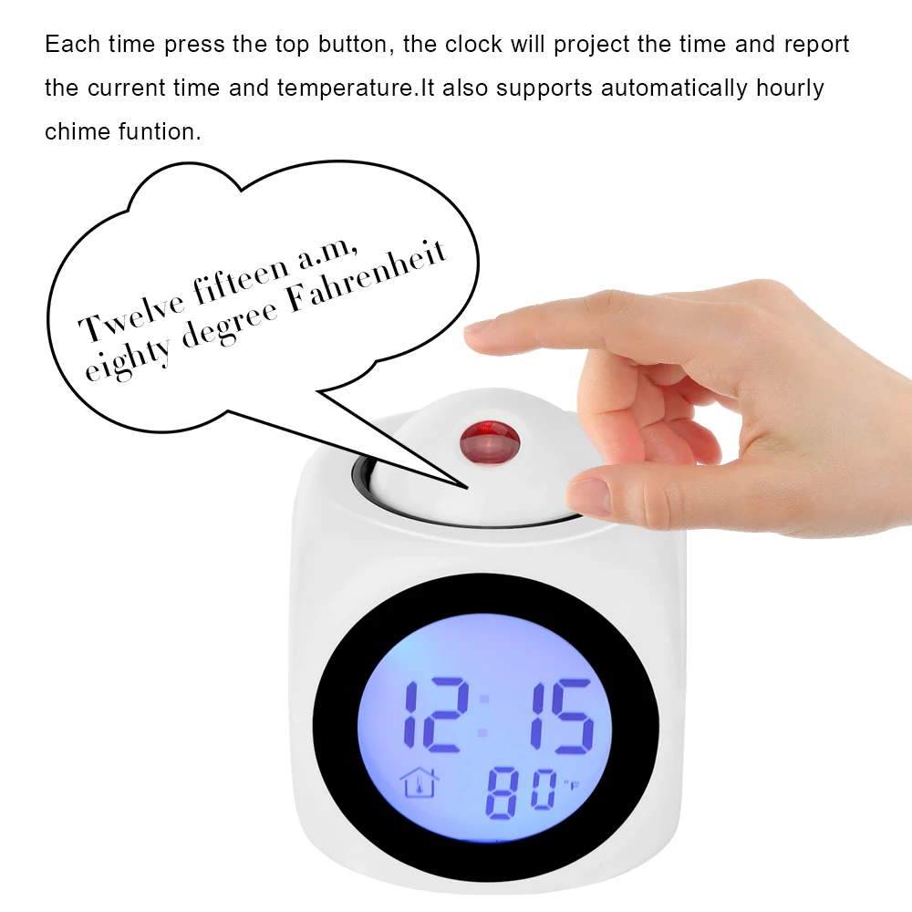 Особенности: Поворотная проекция на 60 градусов гарантирует четкий и крутой обзор времени. Проецируйте ультра-ясное время на стены или потолок. Каждый раз, когда нажимаете верхнюю кнопку, часы проецируют время и сообщают текущее время и температуру. Поддержка автоматически ежечасного звонка. Этот будильник отображает время, температуру, а также имеет формат 12/24 часов и будильник. Поддержка функции повтора 10 минут и 5 звуков будильника могут быть выбраны. Большой ЖК-экран с синей подсветкой, чтобы показать время и температуру Питание от 3 * AAAУглерод-цинкБатареи (не входят в комплект). Это может быть также приведенный в действие DC 5V через 3,5 мм порт (кабель не прилагаются). Маленький размер, удобно разместить в любом месте. Добавьте современный вид в спальню, гостиную или офис. Примечание: 1. Пожалуйста, используйте углеродно-цинковую батарею, не используйте щелочную батарею, или это может повредить часы. 2. При использовании аккумулятора из углеродистого цинка в качестве источника питания подсветка и проекция автоматически отключаются через несколько секунд и снова включается при нажатии кнопки. 3. При использовании DC 4,5 в качестве источника питания, подсветки и проекции сохранит включения и не выключается. В сушильной машине 4. Не используйте питание от аккумулятора и DC 4,5 V мощность в одно и то же время, в противном случае он может привести к повреждению часы. 5. Эти часы не имеют функции отключения памяти. Как установить повтор? Слайд говорящий ключ на положение, когда будильник звонит, нажмите светильник/SNZ ключ на верхней части, чтобы временно остановить будильник, логотип будильника на ЖК-экране будет мигать, и функция повтора запускается автоматически. Интервал времени повтора составляет 10 минут, и будильник будет звонить в течение 6 раз. При звонке будильника нажмите другие клавиши (за исключением клавиши светильник/SNZ) или не используйте функцию повтора. Спецификация: