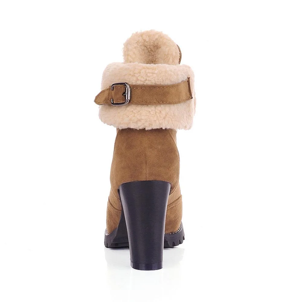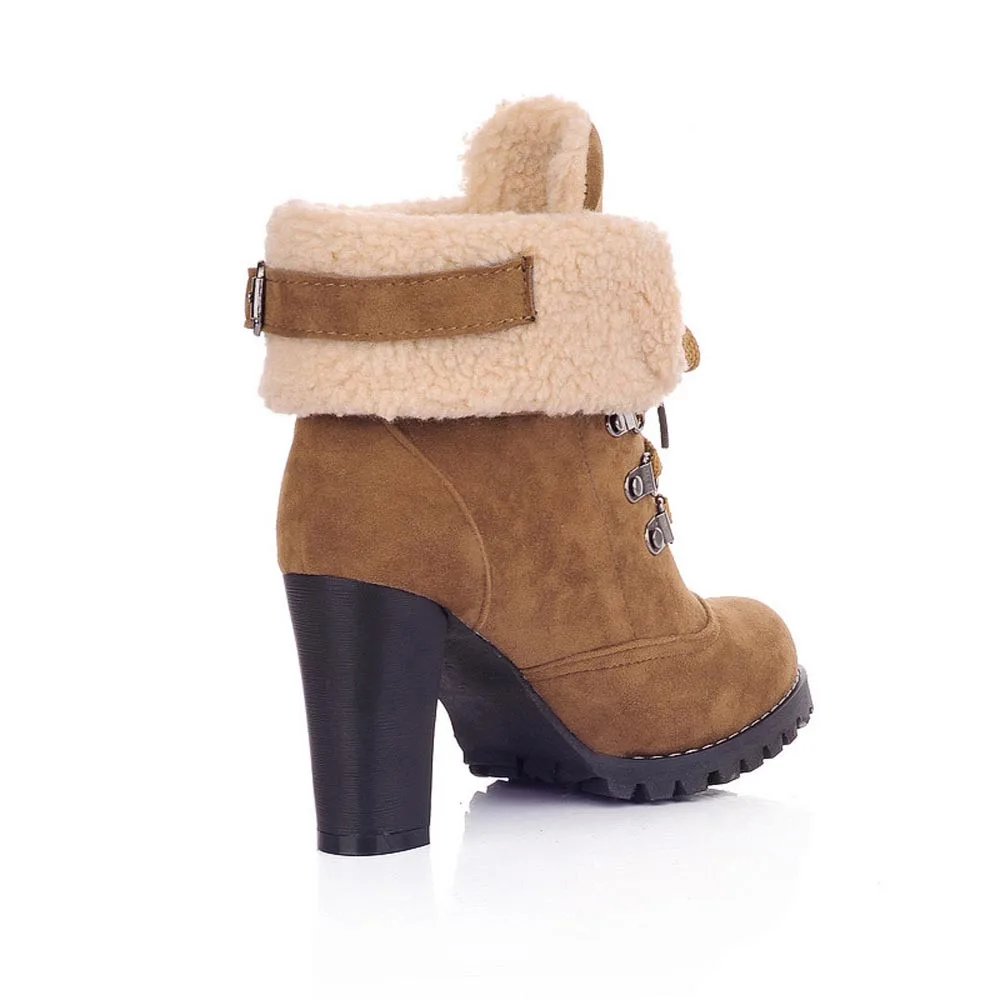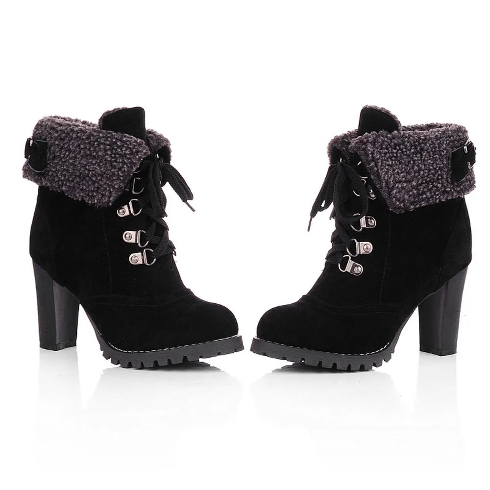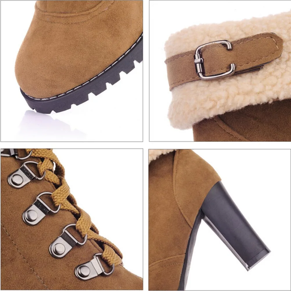 Женские зимние ботинки средней высоты короткие ботинки на Высоком толстом каблуке со шнуровкой ботильоны для отдыха теплые женские ботинки с флисовой подкладкой на высоком каблуке