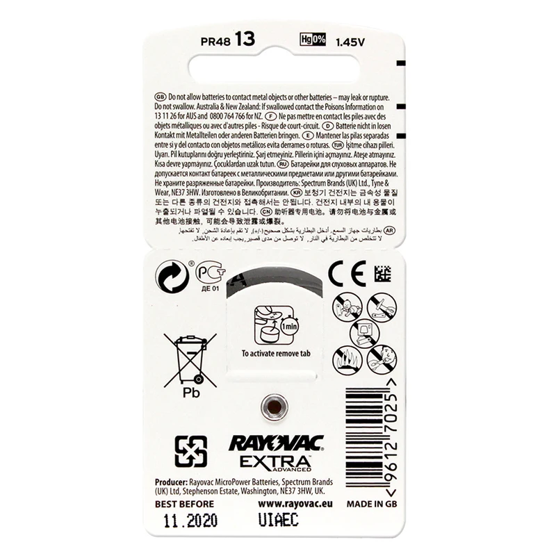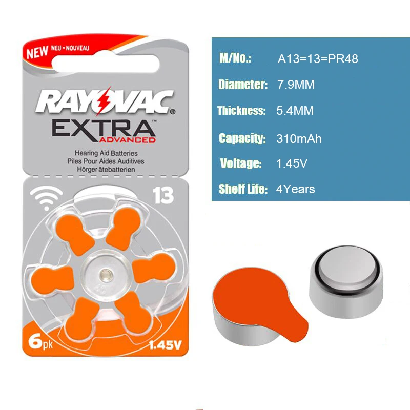 Батареи для слухового аппарата 30 шт.5 карт RAYOVAC EXTRA-A13PR48S13, воздуходувка из цинка, 1,45 в, размер 13, диаметр 7,9 мм, толщина 5,4 мм