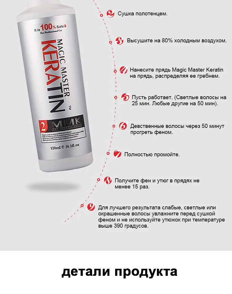 1. Отдельная стирка изделий волосы два раза с волшебной мастера очистки шампунь 2. Полотенца сухой. 3. Сушить 80% с холодным воздухом. 4. Нанесите волшебный мастер на кератиновых пластинах, прядь крупным планом с расческу. 5. Дайте ему работать. (светлые волосы за 25 мин. Любая другая за 50 мин). 6. В случае возникновения бразильские волосы virgin (не подвергавшиеся химическому воздействию) в после 50 мин, прогрейте ее с помощью фена. 7. Промойте кисти его в полном объеме. 8. Получить фена и выпрямитель для волос в пряди не менее 15 раз. 9. Для лучшего результата в слабый, светлые или цветные волосы получают увлажняют перед сушки феном и не используйте плоское железо выше 390 градусов.