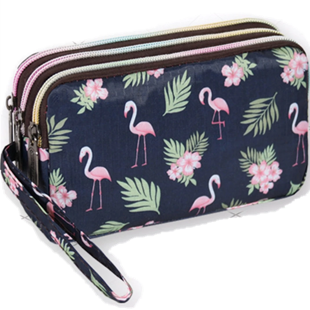 Холщовый кошелек с принтом фламинго, трехслойный, на молнии, большой емкости, дневной клатч, кошелек для мобильного телефона