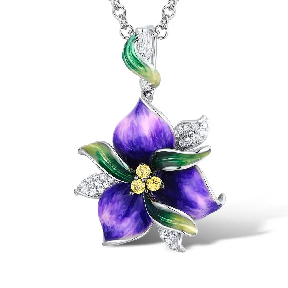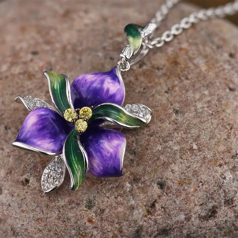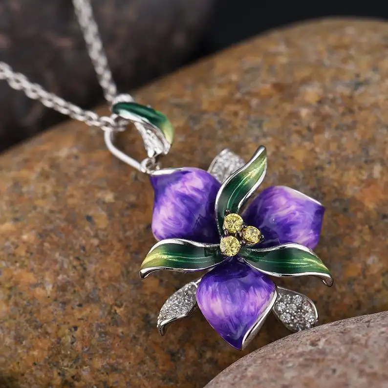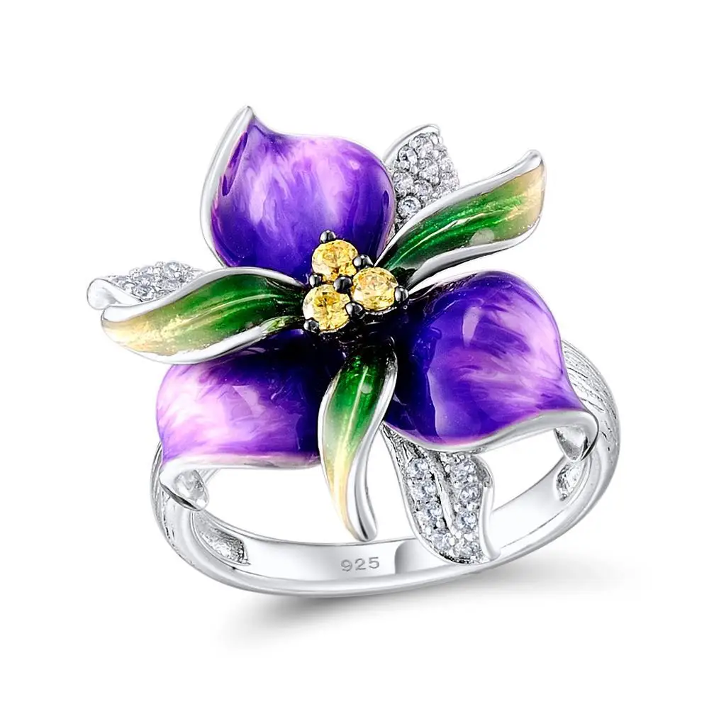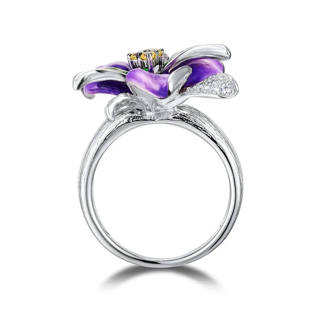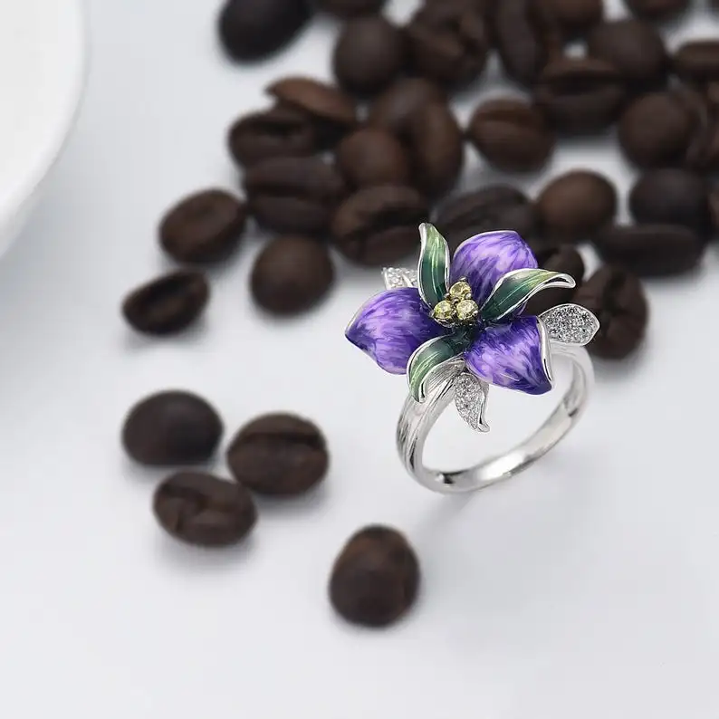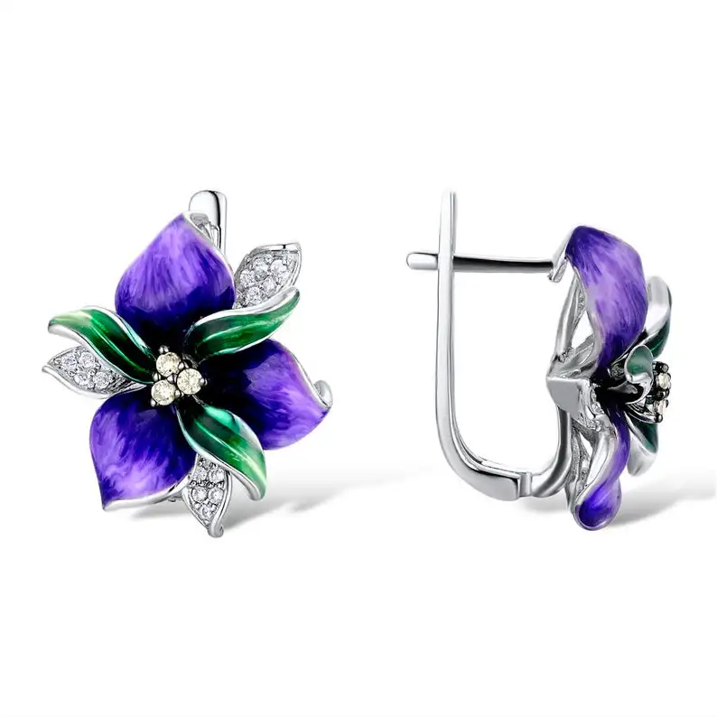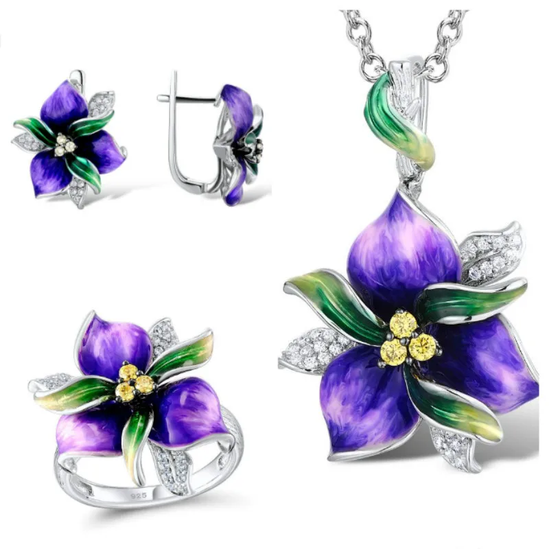 Изысканный Фиолетовый бутон цветок Серебряная Фотография модное эмалированное кольцо серьги подвеска