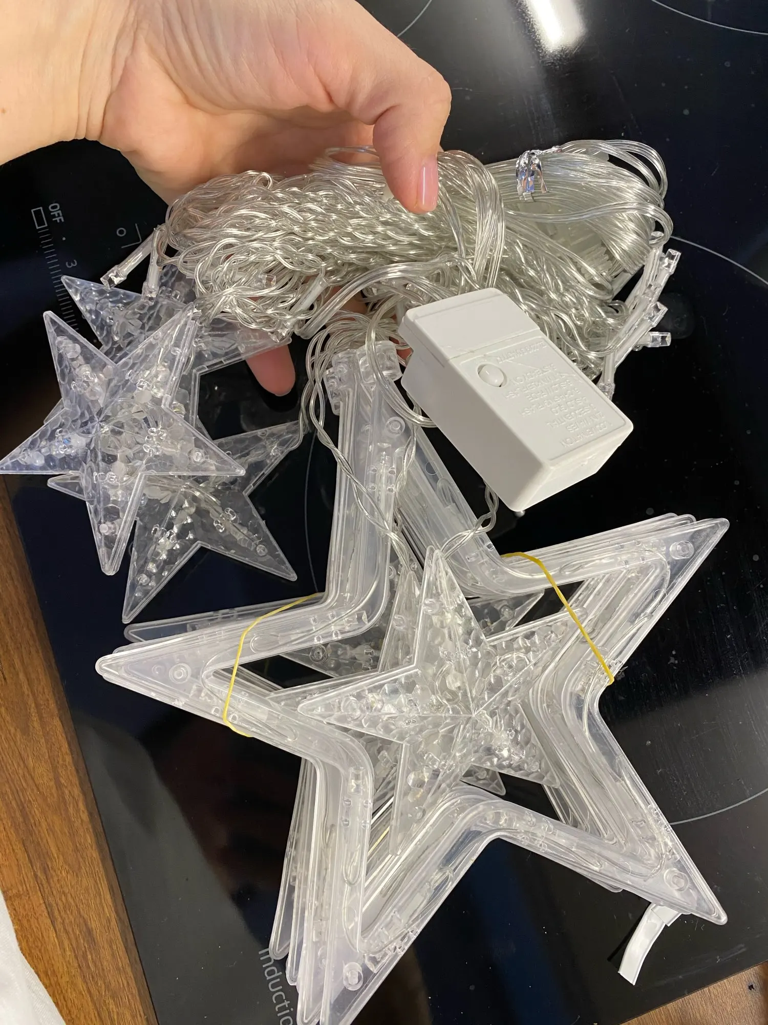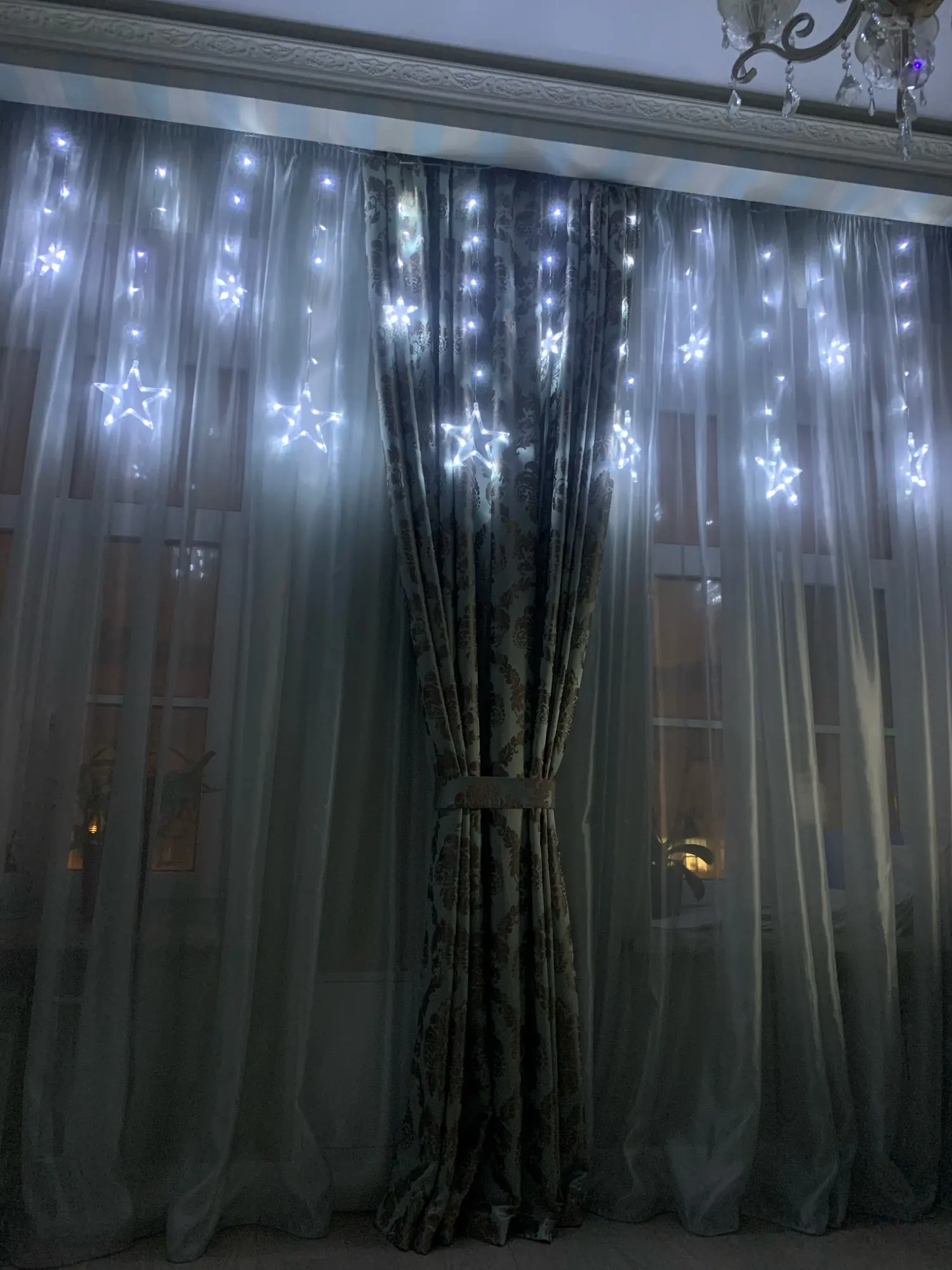 звёзды супер! очень здорово создают атмосферу праздника! с другой стороны есть разъём для подключения второй гирлянды. (можно собрать несколько) шнур к розетке короткий только, получается переключатель режимов под потолком.