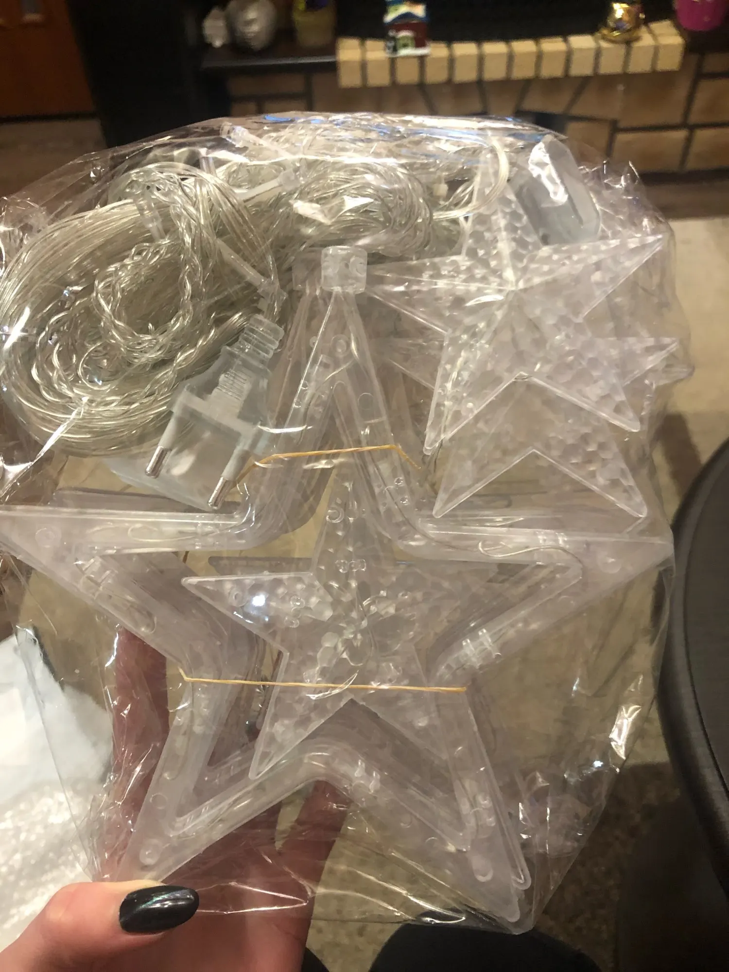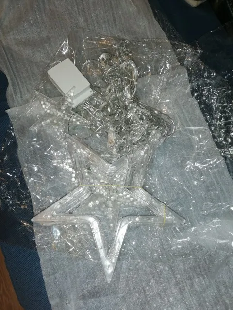 Гирлянда пришла быстро, распутывали её очень долго, а когда повесили очень расстроило то,что посередине не хватало звёздочки,да и другие звёздочки были немного обломанные.Сама гирлянда не симметрична. Открыли спор, продавец вернул часть денег