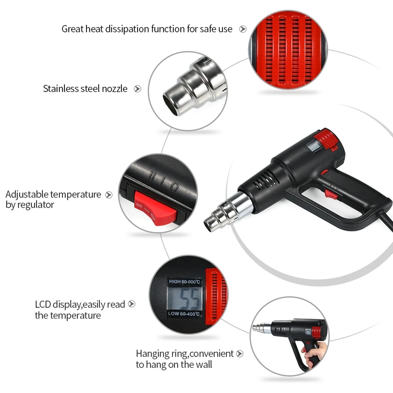 Этот пистолет горячего воздуха с высокой производительностью и долгим сроком службы плавная регулировка температуры. Высококачественные Нагревательные элементы обеспечивают надежную и безопасную работу, быстро и точно нагреваются, используется для многих целей: ослабления винтов, гибки пластиковых труб, удаления краски и т. д.Характеристика:Бесступенчатая регулировка температуры: 60 ℃-590 ℃, легко регулируется термилизатором типа ролика. С 4 различными насадками, удовлетворяя ваши различные потребности в нагреве.Температура на ЖК-дисплее для удобного чтения при эксплуатации. Компактный размер, портативный для использования. 2 регулируемых типа воздушного потока: 250 л/мин или 550 л/мин.Со съемной пылезащитной сеткой для легкой и удобной очистки. Термостойкая Черная передняя крышка защищает ваши руки от ожогов.Характеристики:Цвет: черный + красныйМатериал: пластик + металлТип вилки: ЕСВходное напряжение: AC220-240V, 50-60 ГцВыходная мощность: 1800-2000 ВтБесступенчатая регулировка температуры: 60 ℃-600 ℃Поток воздуха:Ⅰ: 250 л/мин, 60-400 ℃Ⅱ: 550л/мин, 60-600 ℃Дисплей: ЖК-дисплейПрименение: Удалите краску, очистите старые обои, удалите пластиковую напольную плитку, согните ПВХ трубу, расплавьте мусор в трубе, удалите жирный мусор, термоусадочную упаковочную пленку и трубку, выдуйте остатки нити одежды в производстве одеждыРазмер изделия: прибл. 230*180*72 мм/9,1*7,1*2,8 дюймовВес изделия: прибл. 596 г/21,0 унцийРазмер Чехла: прибл. 27,5*26*7,5 см/10,8*10,2*3,0 дюймовПосылка:1 * пистолет горячего воздуха1*3 слоя сопла1*5 слоев сопла1 * плоское сопло1 * сопло термоусадочной трубки1 * Руководство пользователяТип штепсельной вилки: штепсельная вилка европейского стандарта, применяется в Индонезии, Германии, Франции, Испании, Италии и так далее.Примечание:Не нажимайте сопло после или в работе.Держите подальше от детей.Не используйте для фена.Не направляйте тепло к людям или животным.Не используйте его во влажном состоянии.Фокусировка при работе.Только вышеуказанная посылка, другие товары не включены.Примечание: светильник и различные дисплеи могут привести к тому, что цвет товара на картинке немного отличается от реального. Допускается погрешность в измерениях +/- 1-3 см.