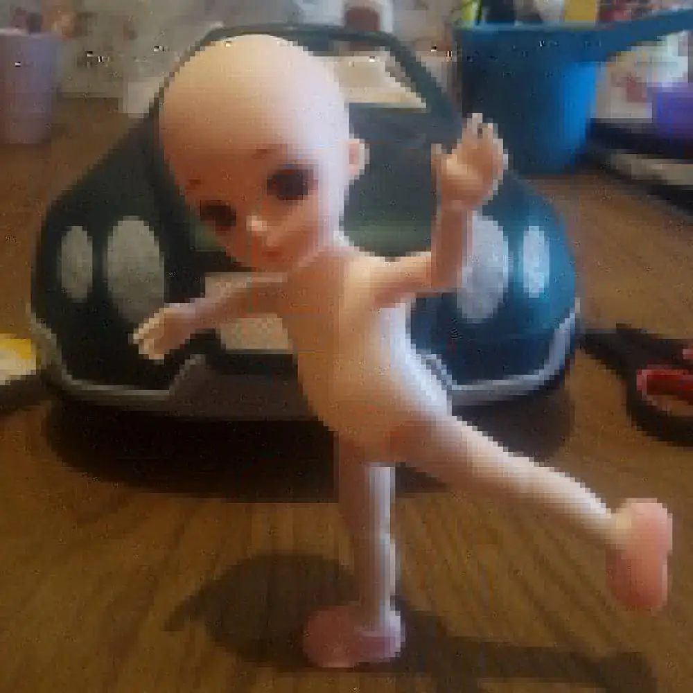 Цвет волос розоватый, один глаз был вставлен криво, пришлось выравнивать, как только выравнила симпопулькой стала) позы держит отлично