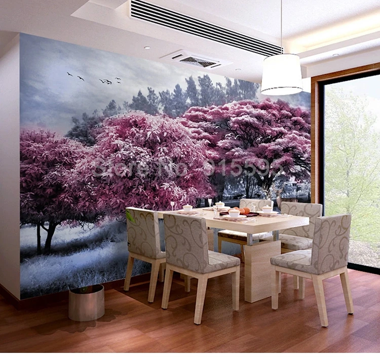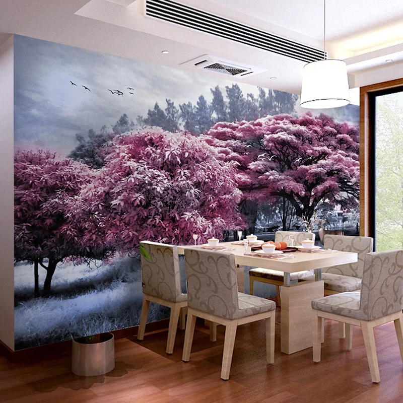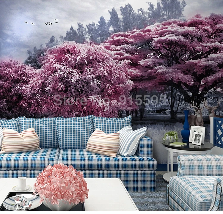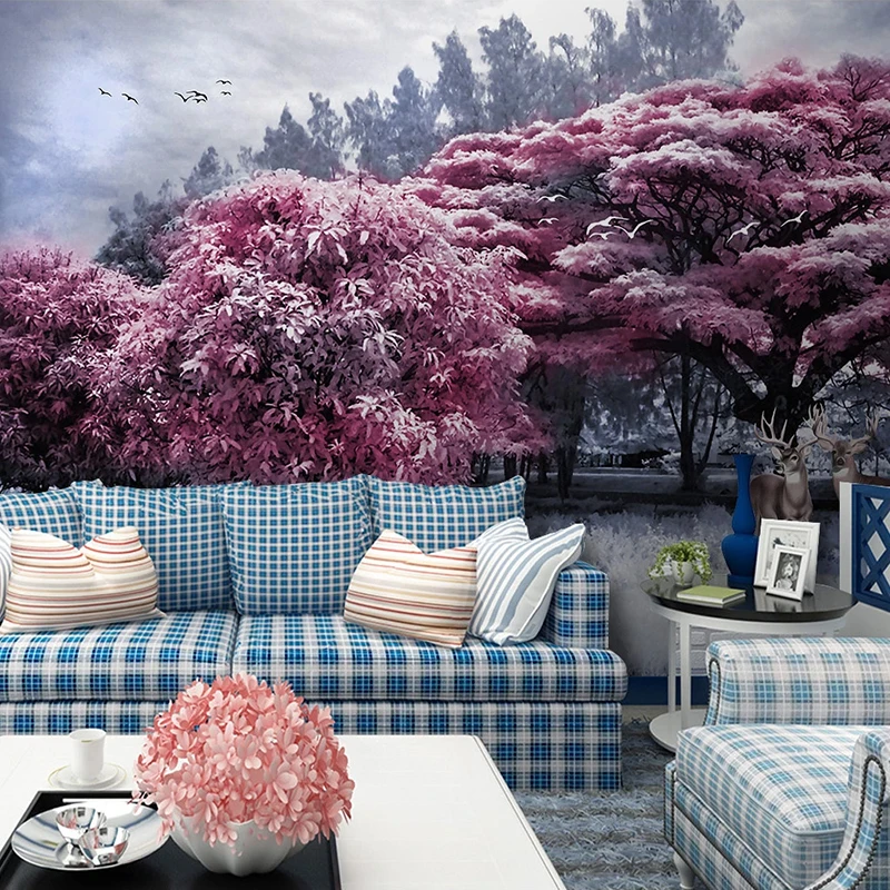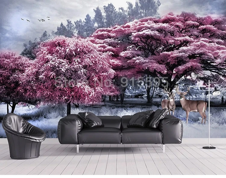Фотообои на заказ, настенная 3D картина с изображением розового леса, большого дерева, лося, природного ландшафта, водонепроницаемые, для гостиной, ресторана