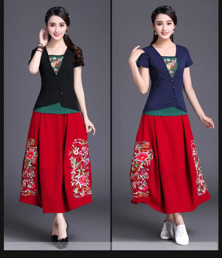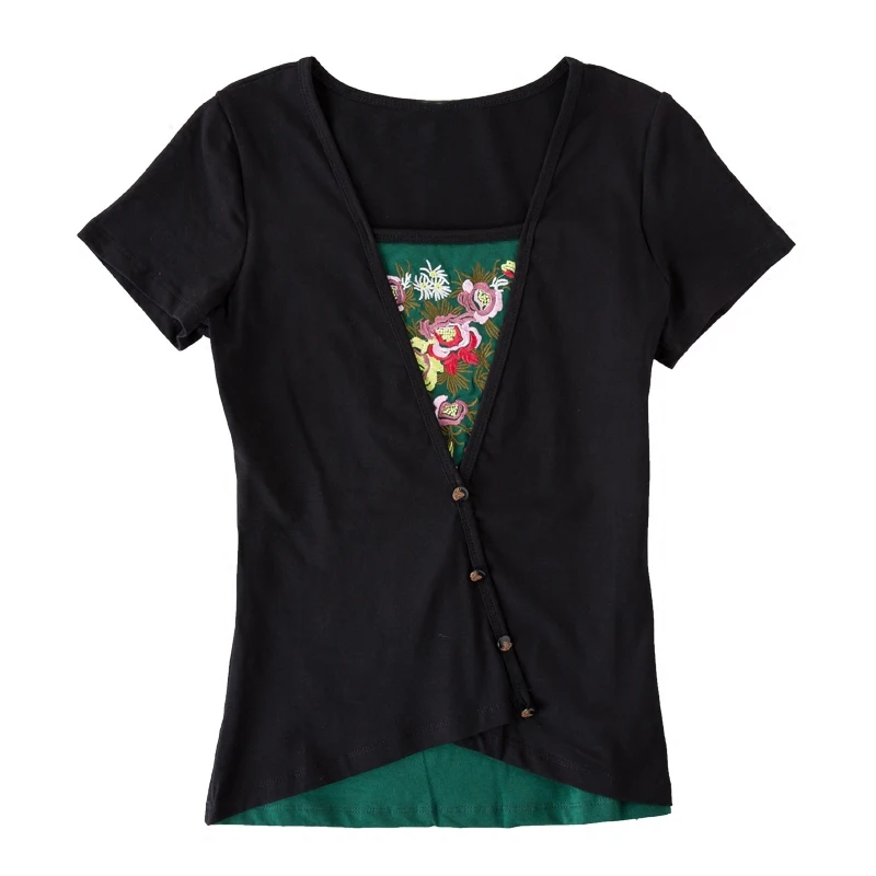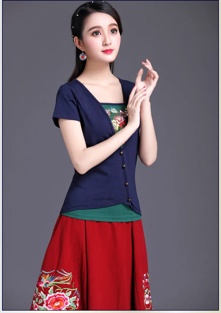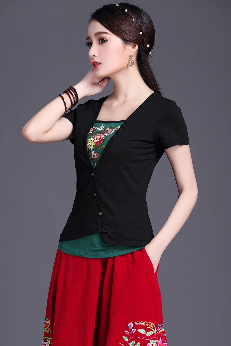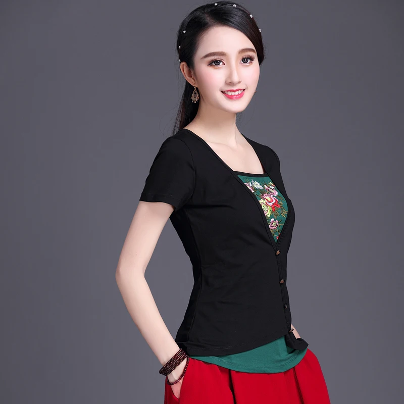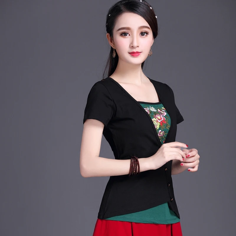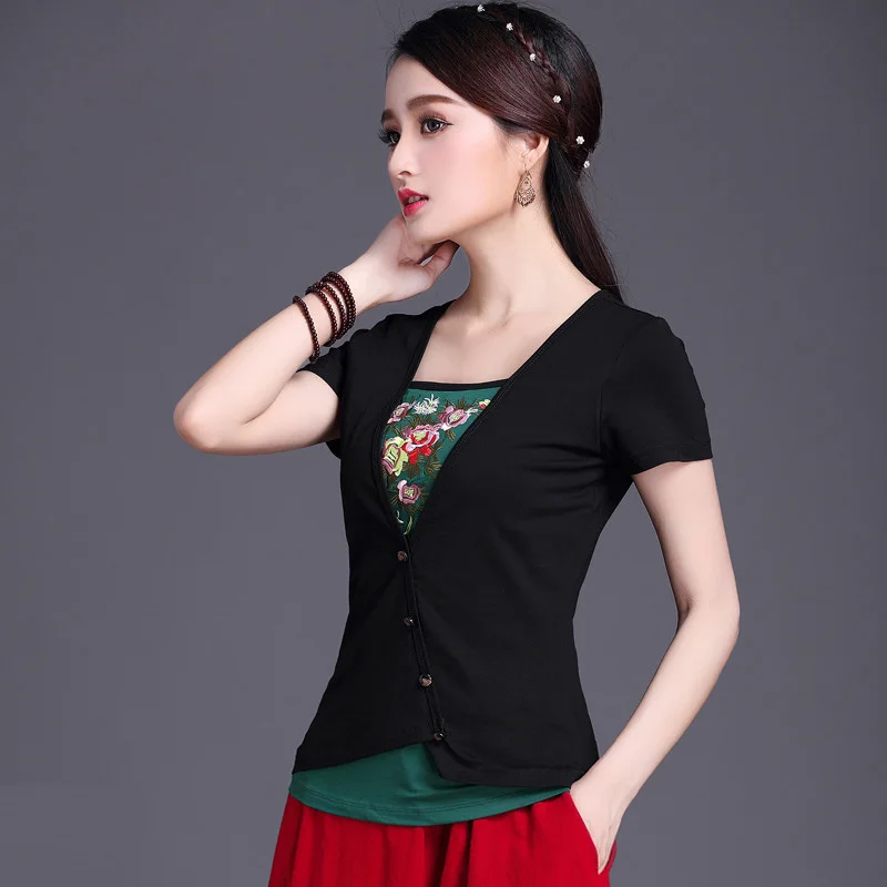 Женский топ с вышивкой в стиле пэчворк, базовый национальный тренд, летний топ с коротким рукавом и вышивкой в китайском стиле, футболка из 100% хлопка