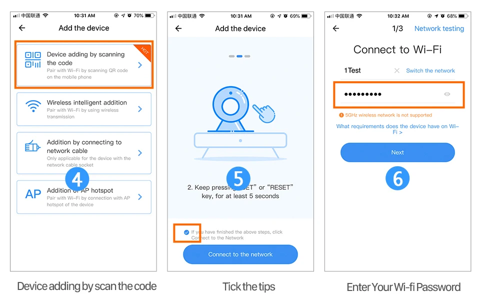 1. Приложение dowнагрузки YCC365 Plus2. Добавить камеру3. Выберите интеллектуальную камеру4. Добавление устройства путем сканирования кода;5. Отметьте кончики;6. Введите пароль Wi-Fi;7. Поместите qr-код лицом к камерам;8. Подождите подключения;9. Получите живой обзор.