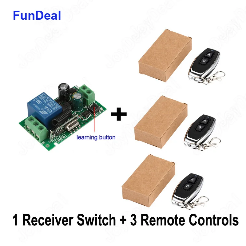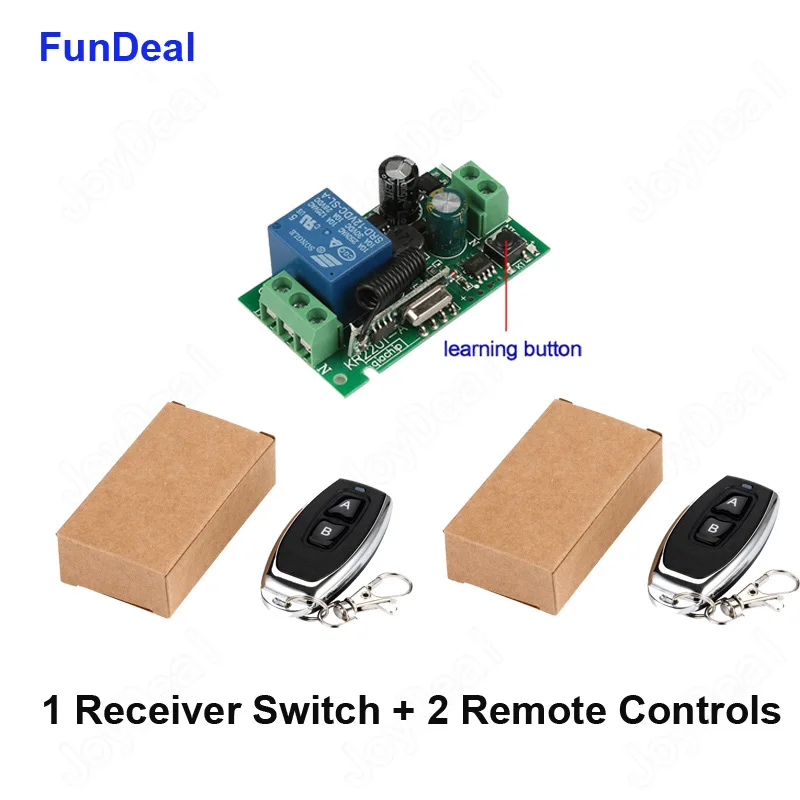 Примечание: Когда вы выбираете режим блокировки, для того, чтобы узнать больше дистанционного управления, вам нужно узнать две разные кнопки, первый раз изучен для «ON», второй раз узнал для «OFF». Например: Кнопка A = ON, кнопка B = OFF Нажмите кнопку обучения на приемнике в три раза, он переходит в режим фиксации. Подождите немного, светодиодный индикатор на плате приемника начнет мигать, а затем выключится. Нажмите кнопку дистанционного управления A. Светодиодный фонарик 5 раз. Нажмите кнопку дистанционного управления B. Светодиодная вспышка 5 раз. Через 3 секунды светодиодный индикатор будет включаться снова и успешно учится. A = ON , B = OFF.