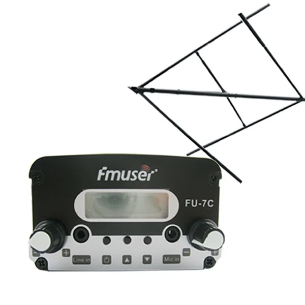 1 * FU-7C 7 Вт fm-передатчик1*12 В адаптер питания1 *CP100 круговой поляризационная антенна1*3,5 мм аудио кабель1*8 м кабель