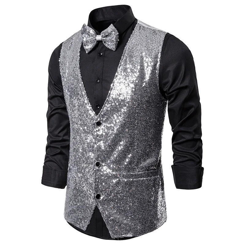 Блестящий жилет с золотыми блестками для мужчин, приталенный мужско...