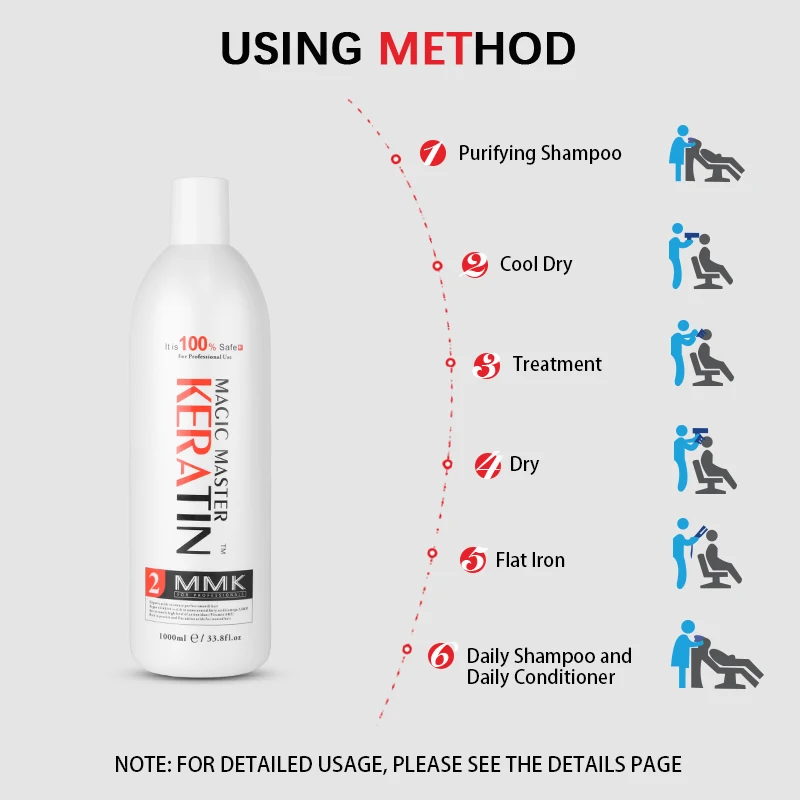 1. Вымойте волосы дважды с помощью волшебного очищающего шампуня 2. Полотенце сухое. 3. Высушите 80% холодным воздухом. 4. Нанесите волшебную магическую кератиновую прядь на прядь с расческой. 5. Дайте ему работать. (светлые волосы на 25 мин. Любые другие на 50 мин). 6. В чехол из девственных волос, после 50 мин, согрейте его с помощью сушилки. 7. Краску полностью. 8. Получите фен и плоское железо в прядях не менее 15 раз. 9. Для лучшего результата при слабом, белокуром или цветном оттенке волосы становятся увлажненными перед высыханием и не используйте плоское железо выше 390 градусов.