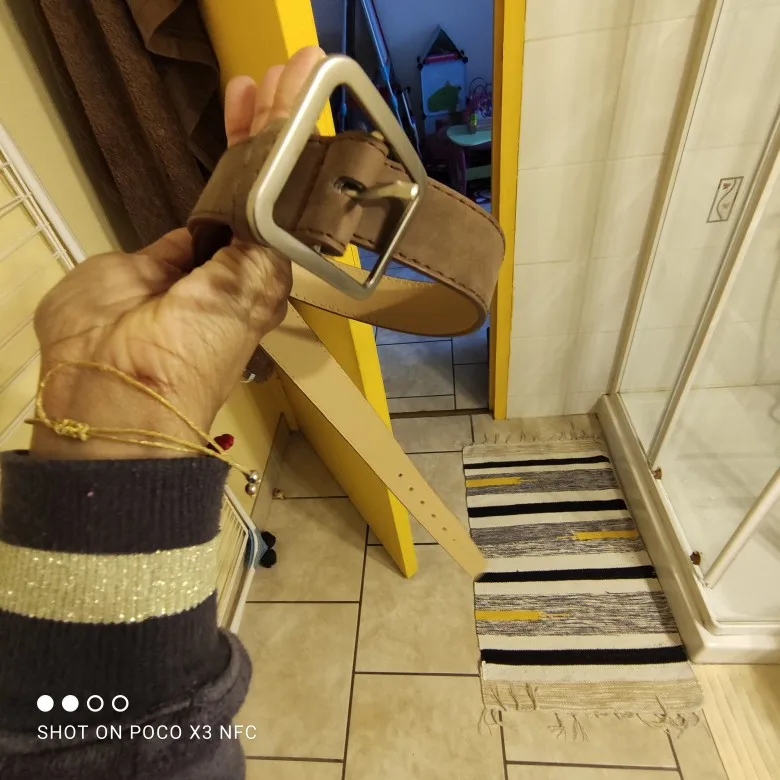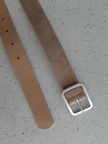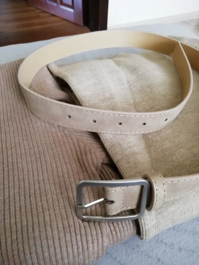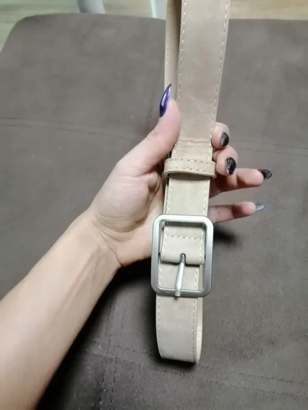 Ремень хороший с виду. Соответствует фото, думала будет пошире. Пряжка хорошая, не царапает ремень. Размеры ремня: ширина самого ремня около 3 см., ширина пряжки 4 см. Длина 104см. Единственное, на талию 64 см дырочек не хватило . Придется добавлять еще 3 дырки ремень не обрежешь