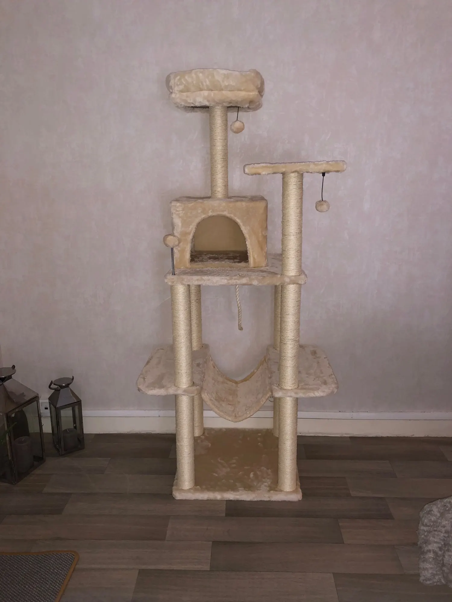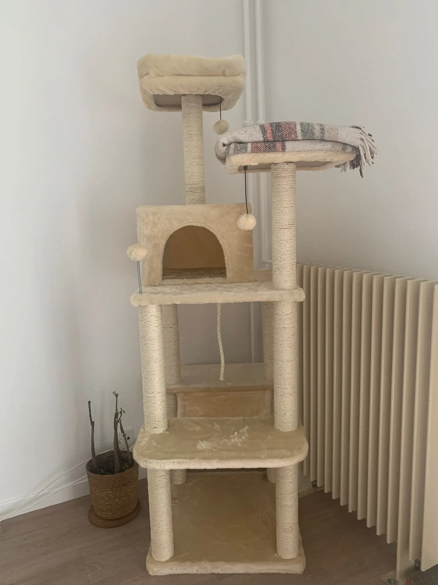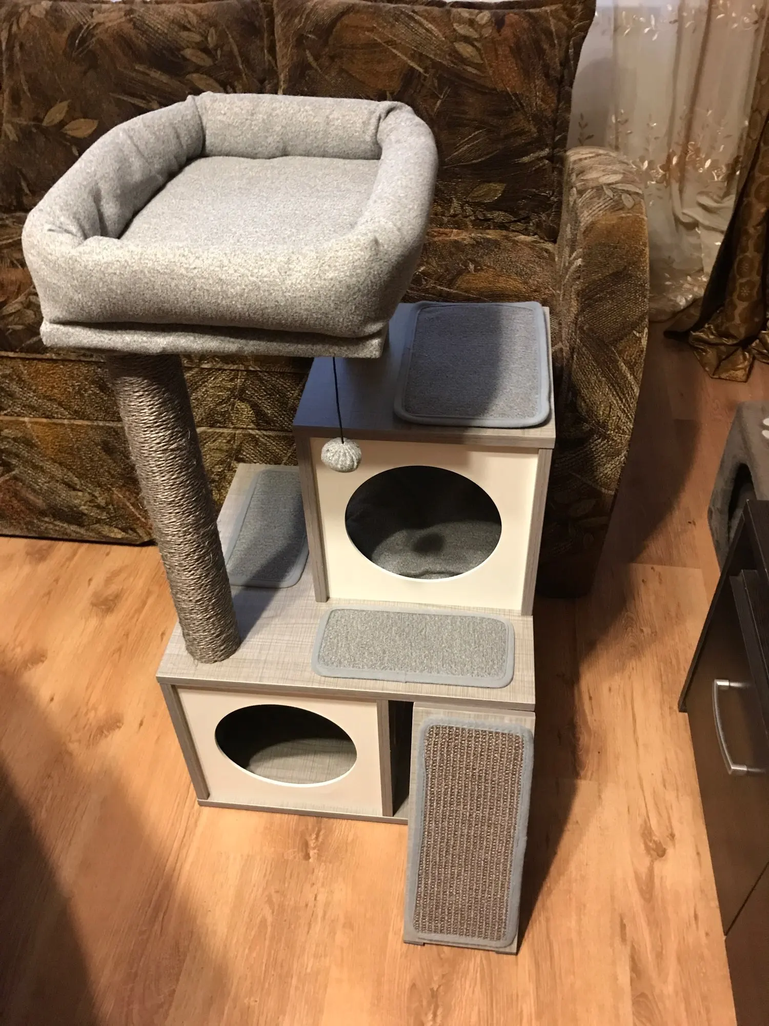 Хороший комплекс, собрали по инструкции без проблем. Материал приятный, коту понравился, лежит наверху или спит в домике. Он у нас не маленький ~5кг, но помещается. Пришёл очень быстро экспресс доставкой.
