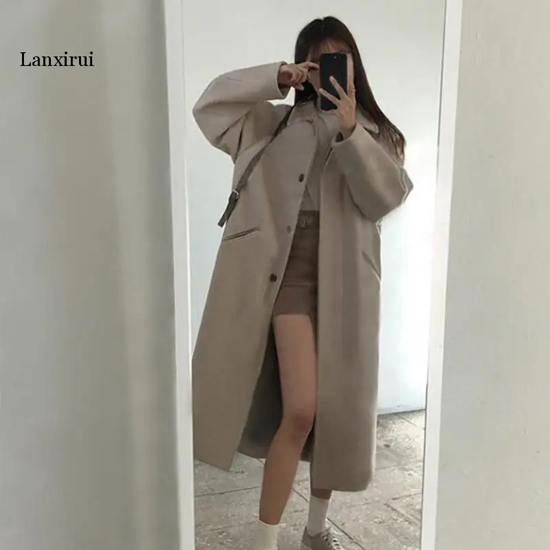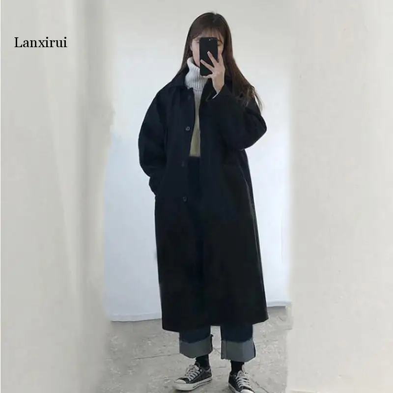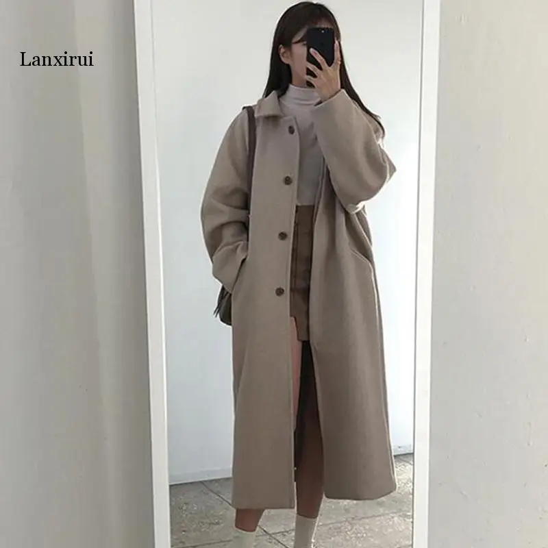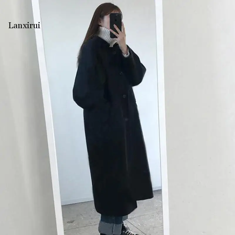 Женская шерстяная куртка средней длины, элегантное свободное однотонное пальто в Корейском стиле для зимы
