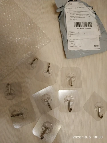 Посылка пришла в обычной пупырке. основание крючков помялось о другие крючки. Одну попробовал приклеить держится хорошо, большие нагрузки не выдержит не из за основания, а по причине тонких стенок самой пластмассы которая держит железный крючок.