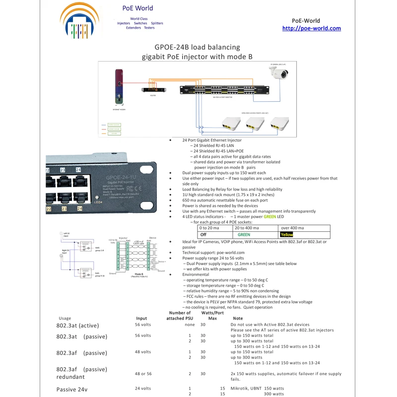 • Идеально подходит для ip-камер, VOIP телефонов, Wi-Fi точек доступа с 802.3af или 802.3at или пассивным• Диапазон питания от 24 до 56 вольт-Двойной Мощность поставить входами (2,1 мм x 5,5 мм) смотрите таблицу ниже-Мы предлагаем комплекты с источником питания• Экологический-Диапазон рабочих температур-от 0 до 50 градусов C-Диапазон температур хранения-от 0 до 50 градусов C-Диапазон относительной влажности-от 5 до 90% без конденсации-Правила FCC-в конструкции нет устройств с радиочастотным излучением-Устройство PELV по стандарту NFPA 79, защищено от сверхнизкого напряжения-Не требуется охлаждение, нет вентиляторов. Тихая работа